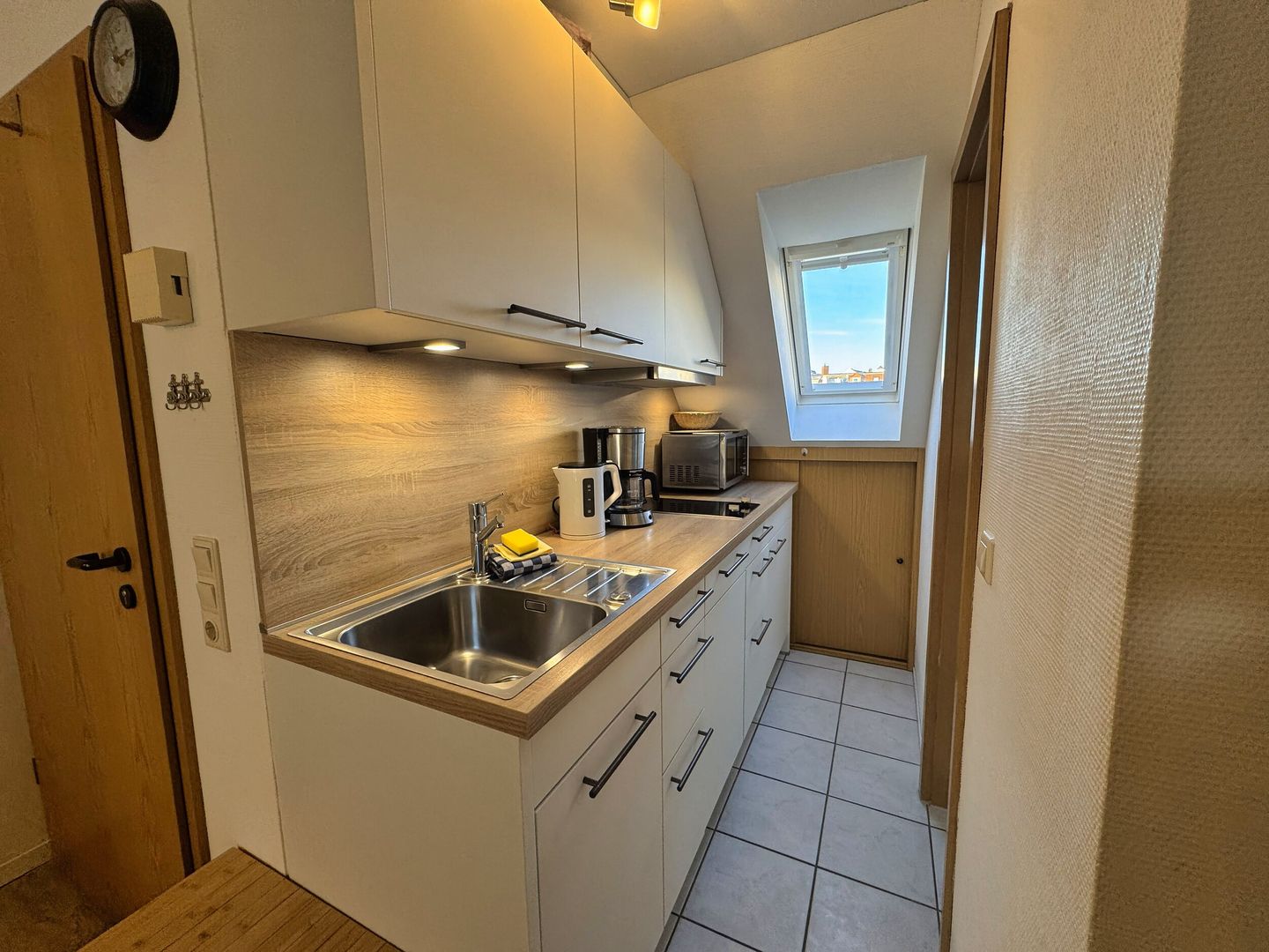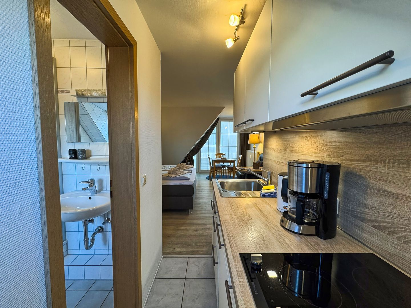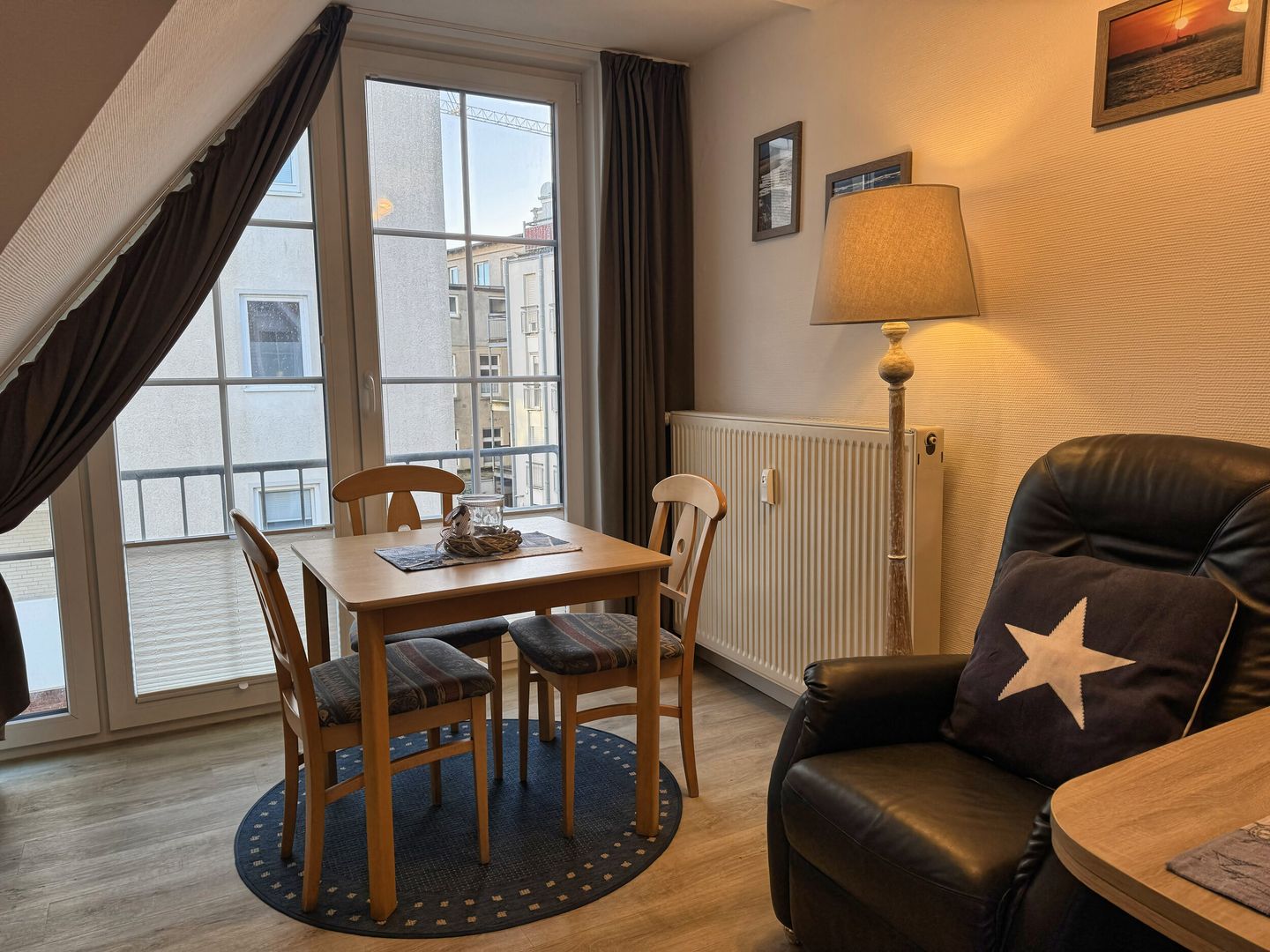 Der clever eingerichtete Wohn-Schlafraum bietet außerdem Platz für zwei Sessel, Essecke am Fenster und eine voll ausgestattete Küchenzeile in einer Nische vor dem Badezimmer. Das Tageslichtbad hat Dusche/WC. Kein Wlan. Bäcker, Lebensmittelgeschäfte in der Strandstraße und die Strandpromenade sind um zwei Straßenecken fußläufig zu erreichen.