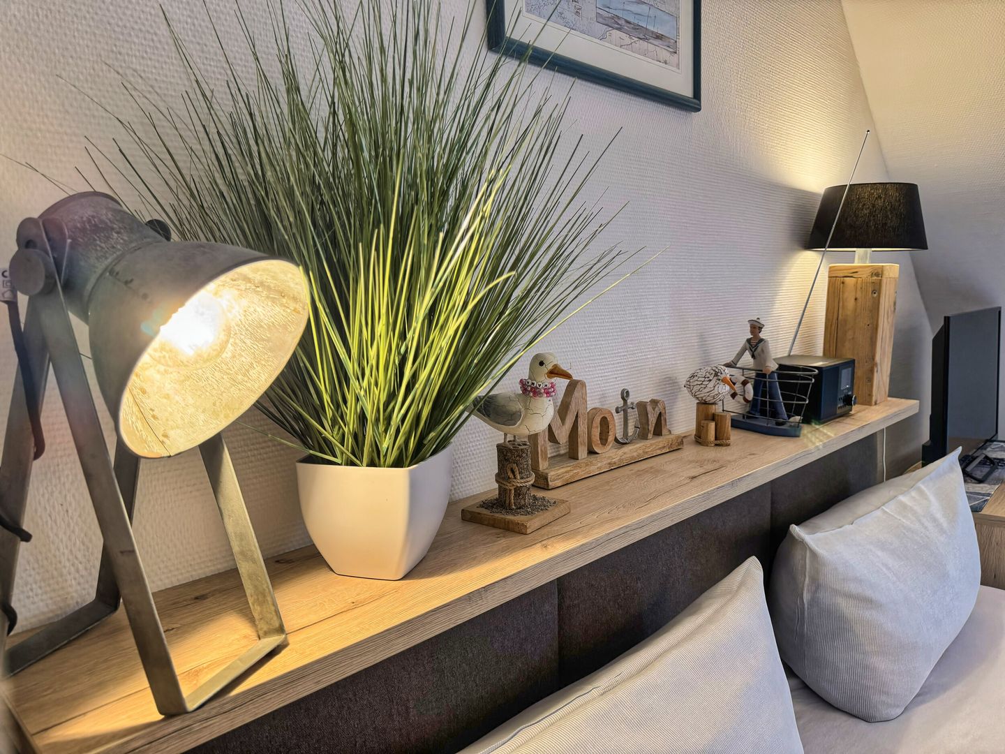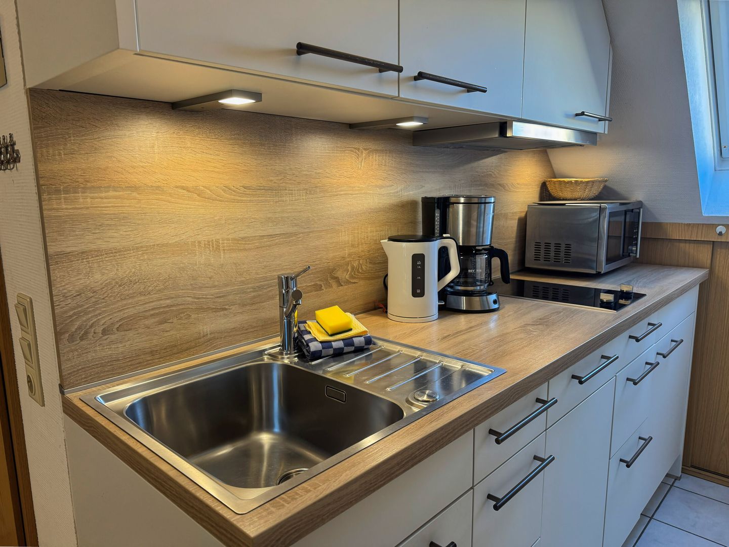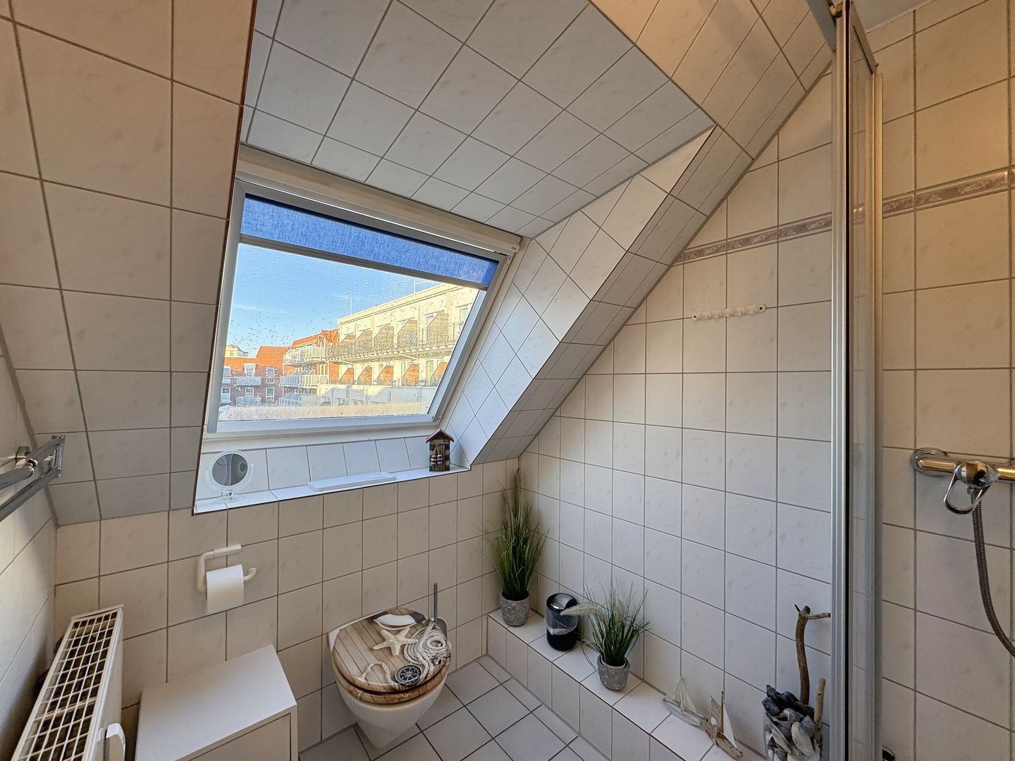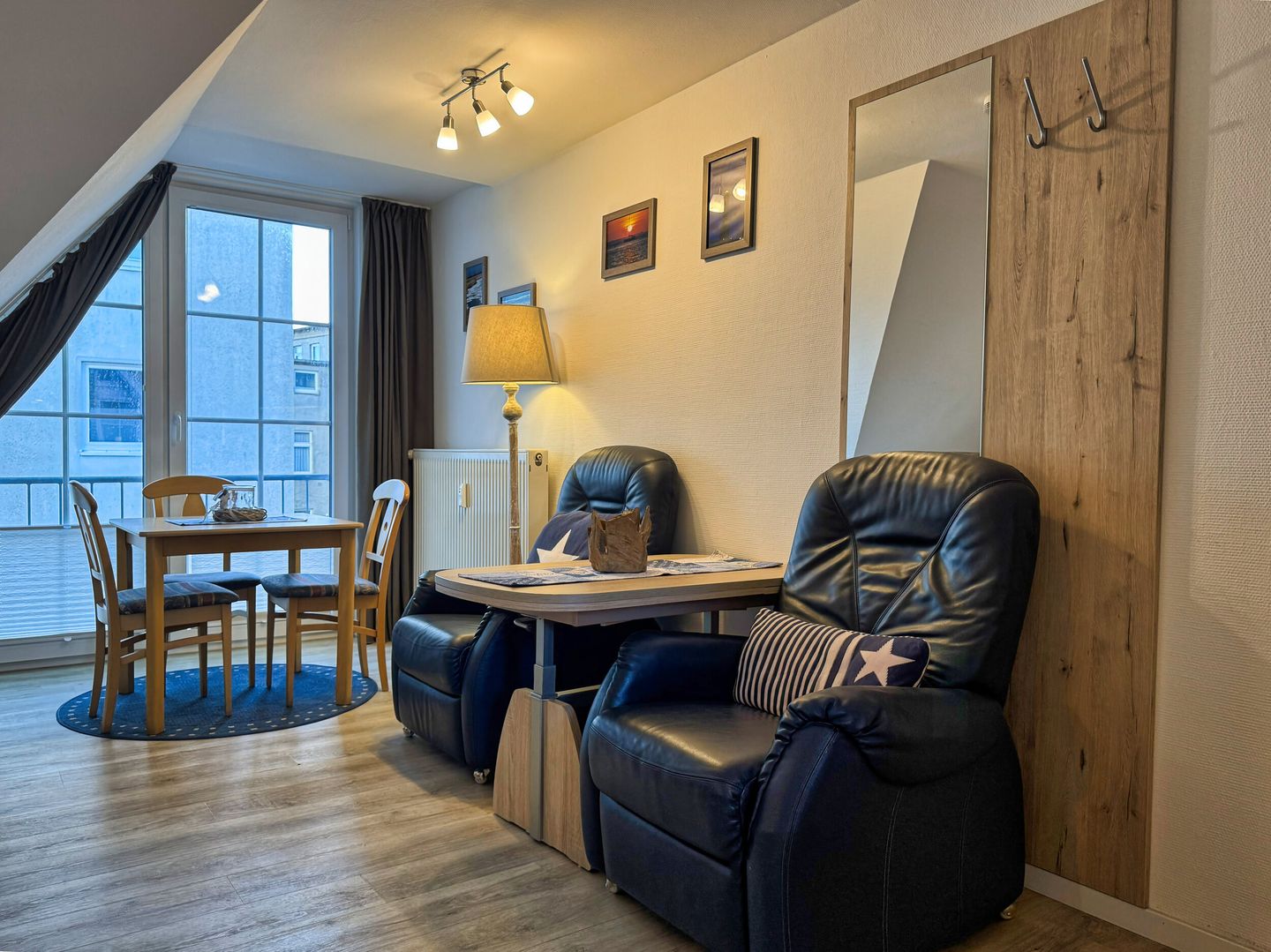 Der clever eingerichtete Wohn-Schlafraum bietet außerdem Platz für zwei Sessel, Essecke am Fenster und eine voll ausgestattete Küchenzeile in einer Nische vor dem Badezimmer. Das Tageslichtbad hat Dusche/WC. Kein Wlan. Bäcker, Lebensmittelgeschäfte in der Strandstraße und die Strandpromenade sind um zwei Straßenecken fußläufig zu erreichen.