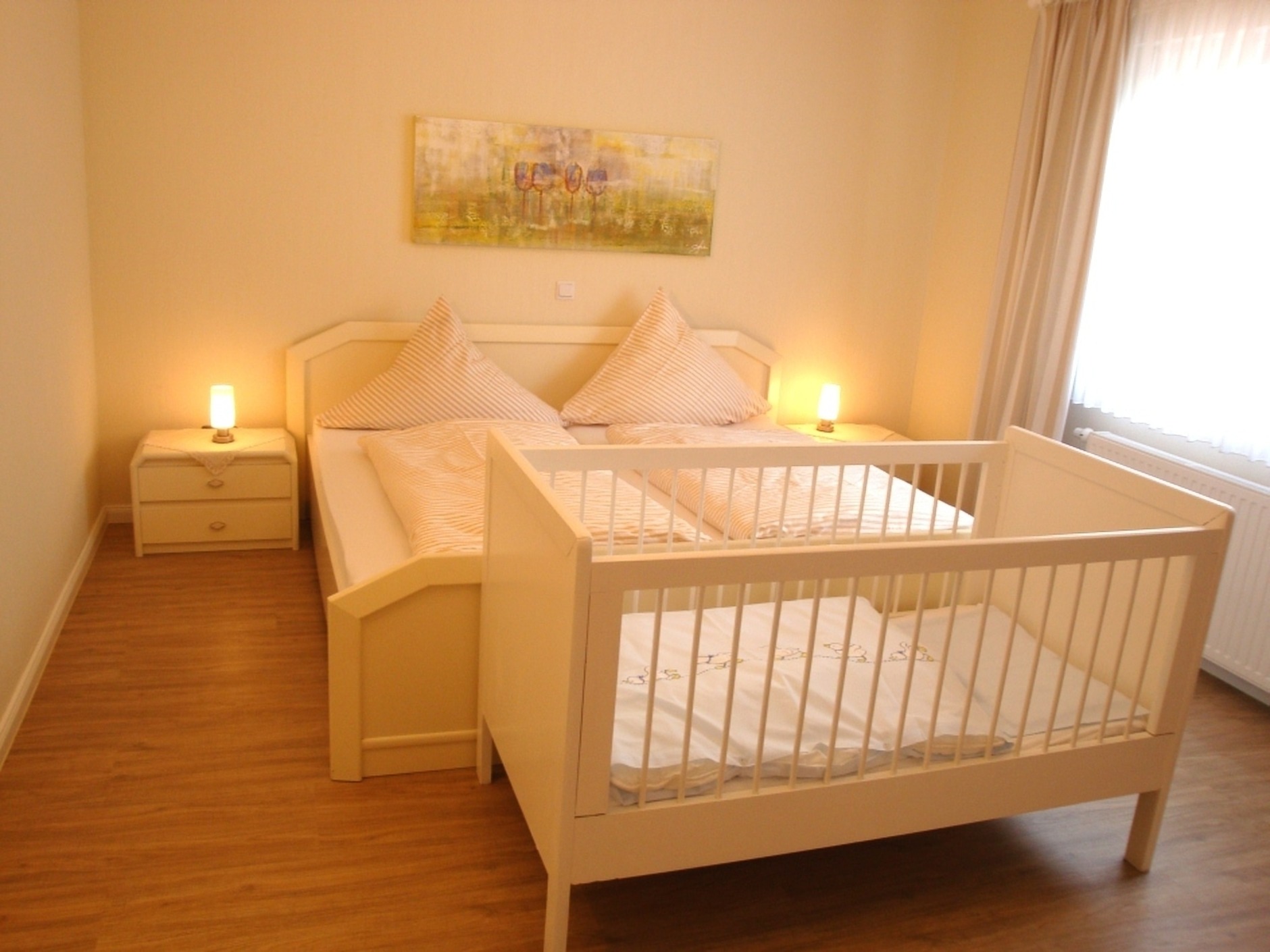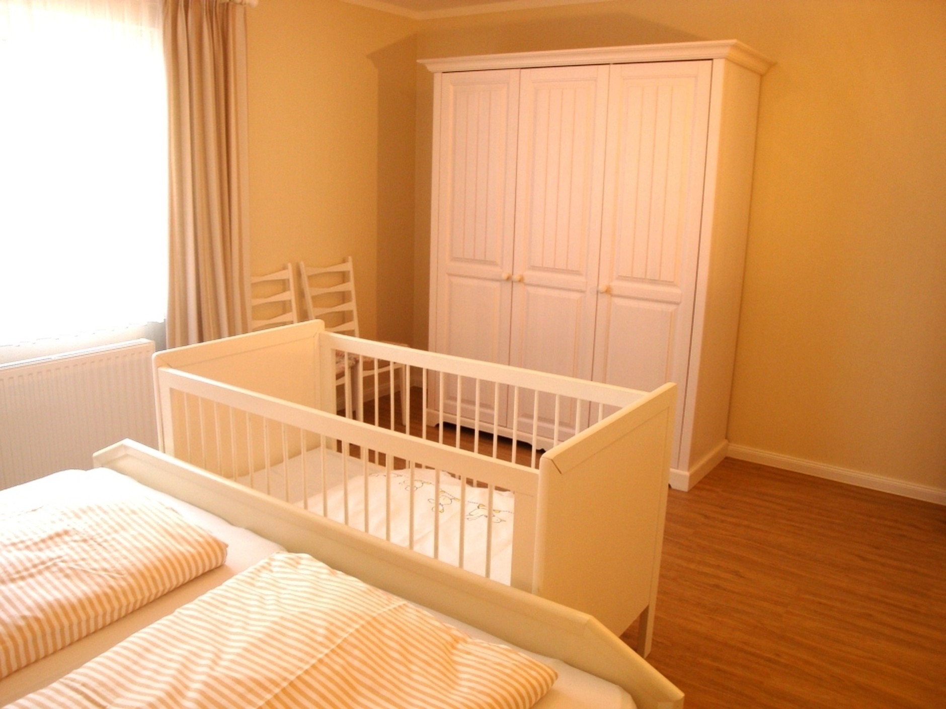 In der Ferienwohnung befinden sich drei Schlafzimmer, zwei mit einem Doppelbett und in einem Schlafzimmer sind die Betten auseinander gestellt. Beide Bäder sind mit fast ebenerdiger Dusche mit Glastrennwänden ausgestattet.