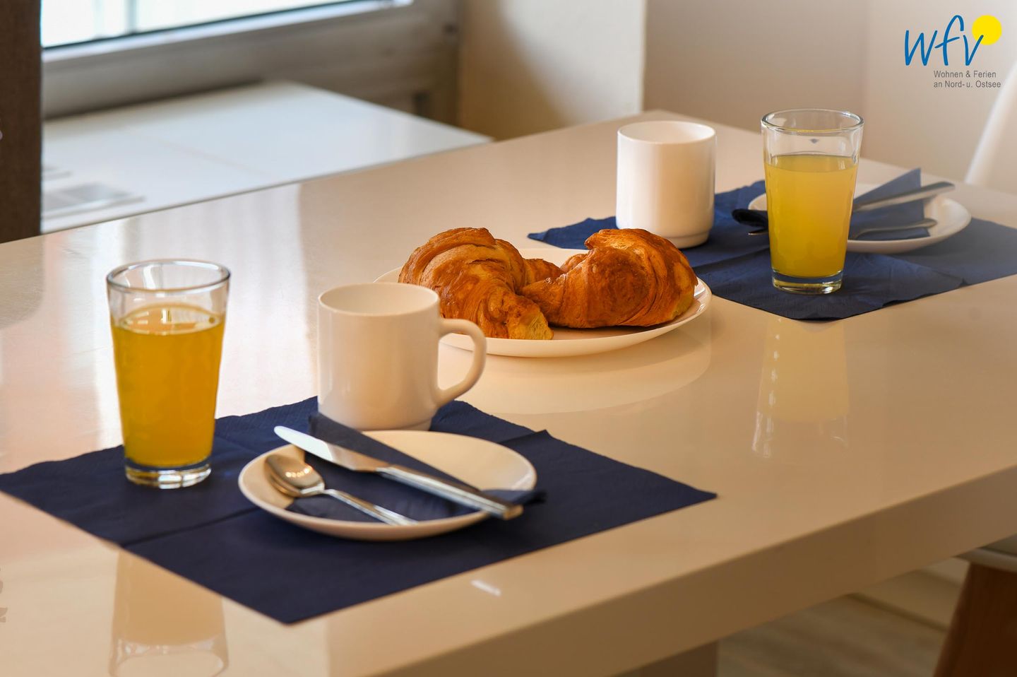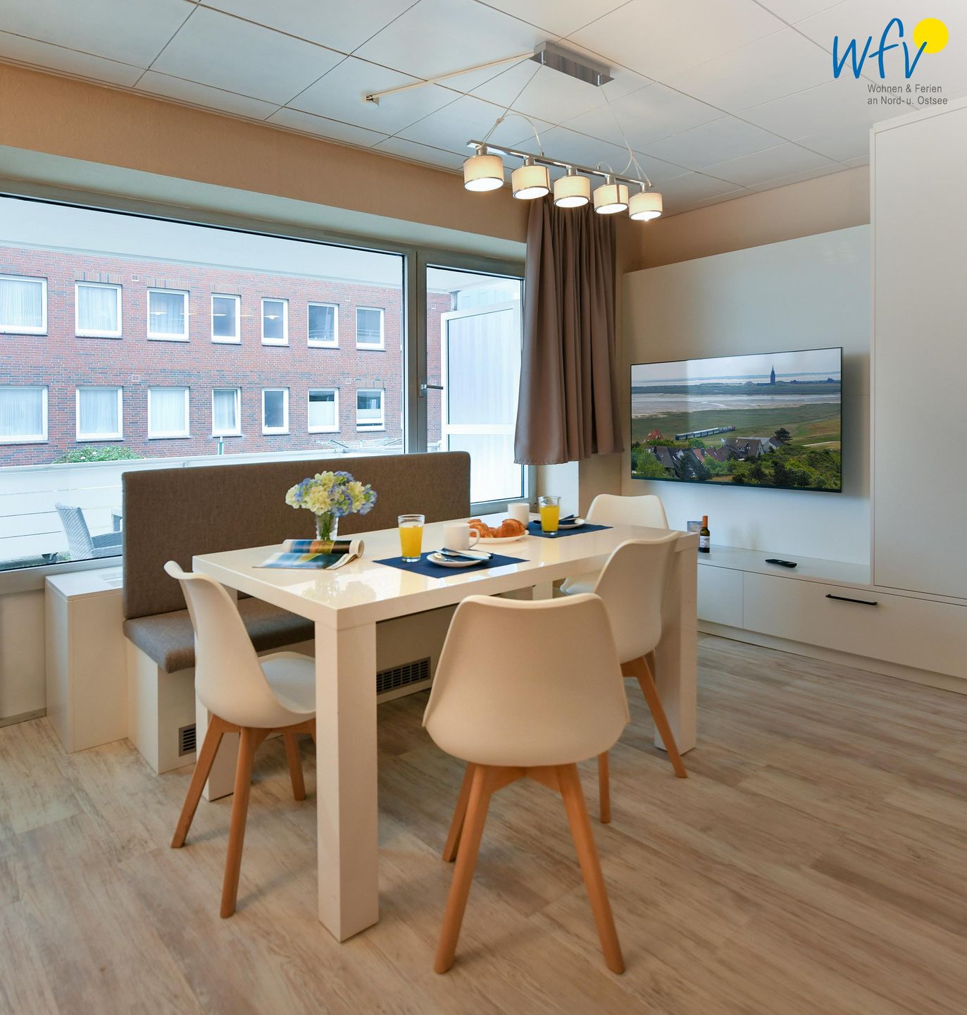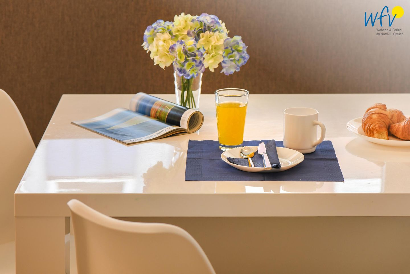 Unsere moderne Einbauküche ermöglicht Ihnen eine angenehme Selbstverpflegung in Ihrem Urlaub auf Wangerooge! Sie verfügt u.a. über ein 4-Platten Cerankochfeld mit Dunstabzugshaube, einen Backofen mit integrierter Mikrowelle, einen Kühlschrank mit Gefrierfach und eine kleine Spülmaschine. Für gemeinsame Mahlzeiten befindet sich im Wohnraum ein gemütlicher Essplatz mit sechs Plätzen. Ein Kinderhochstuhl gehört zum festen Inventar der Wohnung.