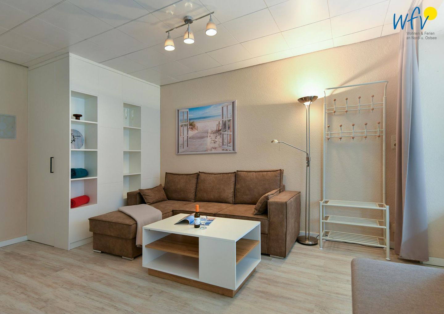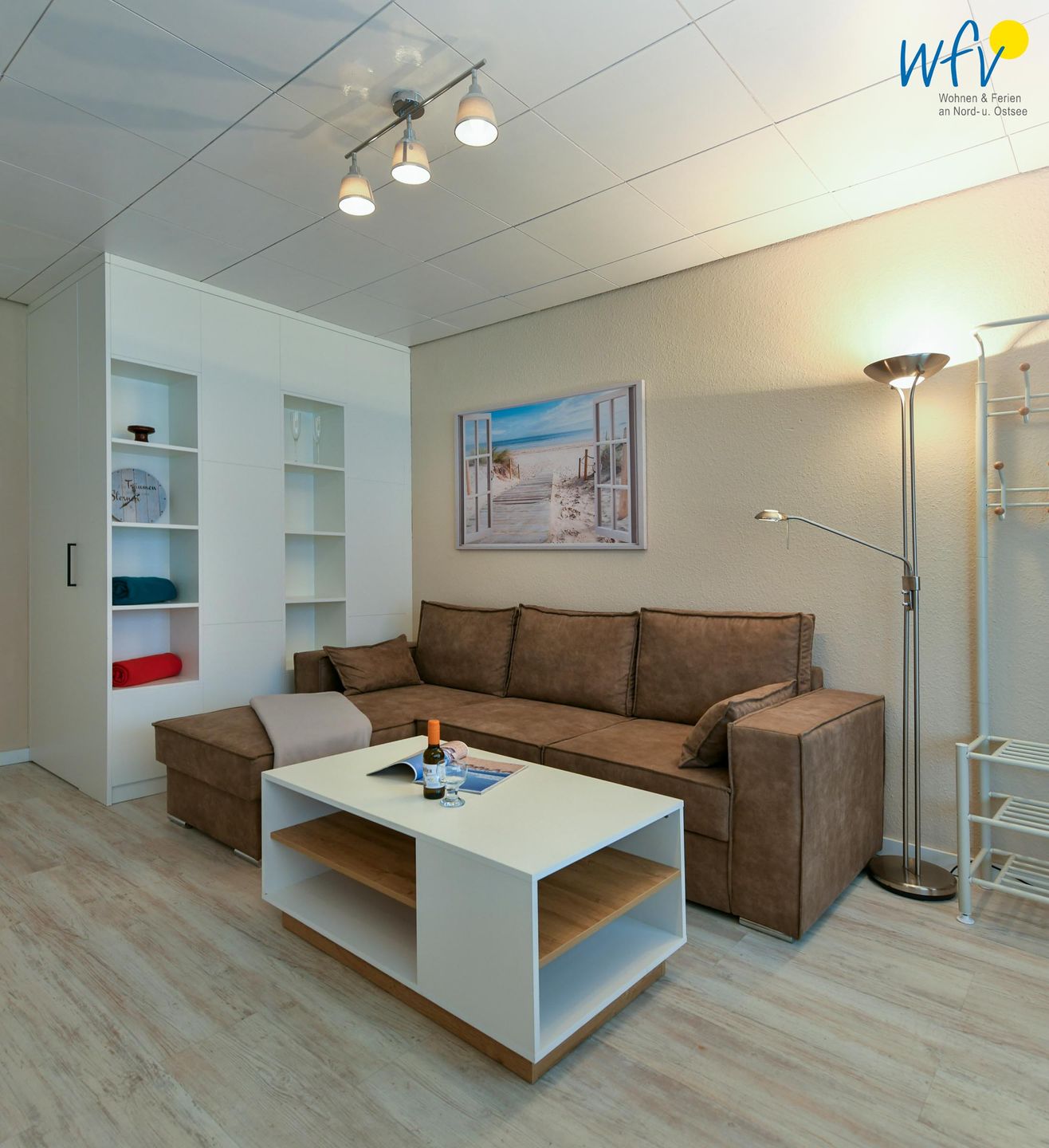 Für erholsame Zeiten in Ihrem Wangerooge-Urlaub ist das Wohnzimmer mit einer bequemen Couchecke mit TV eingerichtet. So können Sie ausgiebig entspannen und gemütlich den Urlaubstag ausklingen lassen. Durch eine große Fensterfront besitzt dieses Zimmer einen schönen Lichteinfall und damit eine freundliche Atmosphäre.