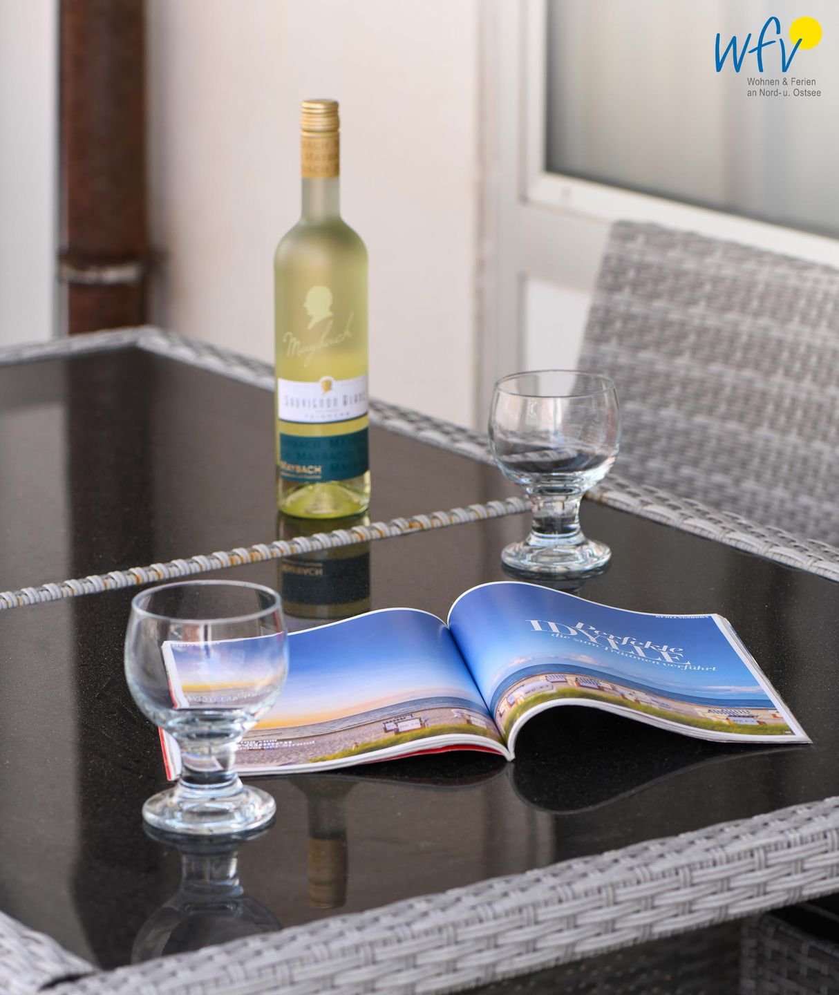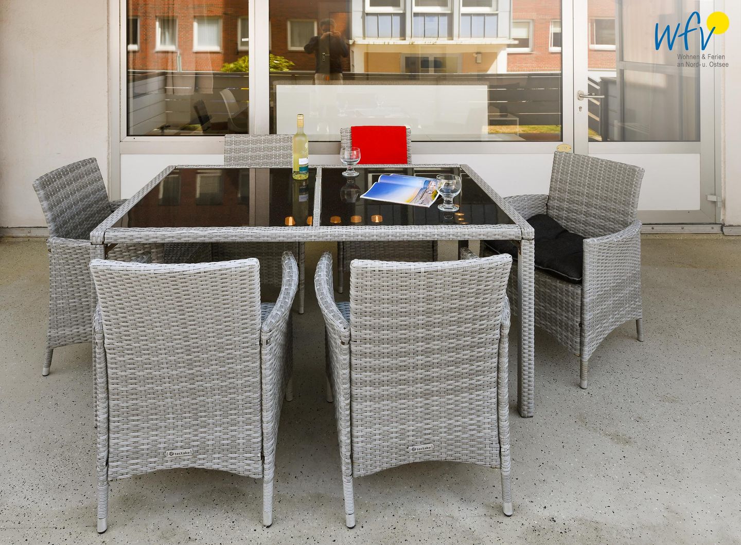 Frische Nordseeluft genießen Sie auf der möblierten Terrasse der Wangerooger Ferienwohnung. Ein wohltuender Ort, um in Ruhe eine spannende Urlaubslektüre lesen, gemeinsame Mahlzeiten zu genießen oder einfach nur die Seele baumeln zu lassen.