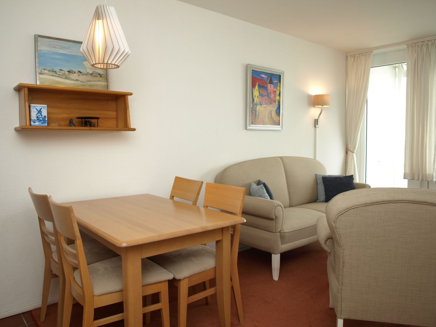 Die Wohnung verfügt über ein separates Schlafzimmer mit einem großzügigen Doppelbett (1,80 x 2,00 m). Der Wohnraum ist gemütlich eingerichtet mit Sofa und Sessel und bietet eine integrierte Küchenzeile sowie einen Essplatz für gemeinsame Mahlzeiten. Ein praktisches Etagenbett befindet sich im Eingangsflur und bietet den Kindern einen eigenen Rückzugsort.