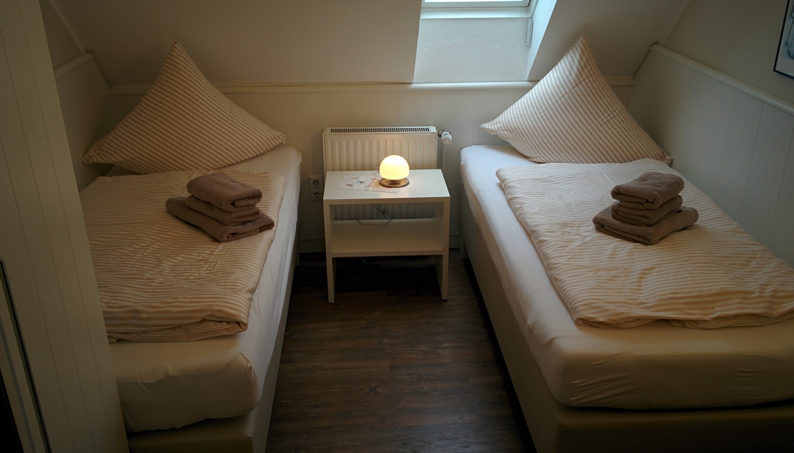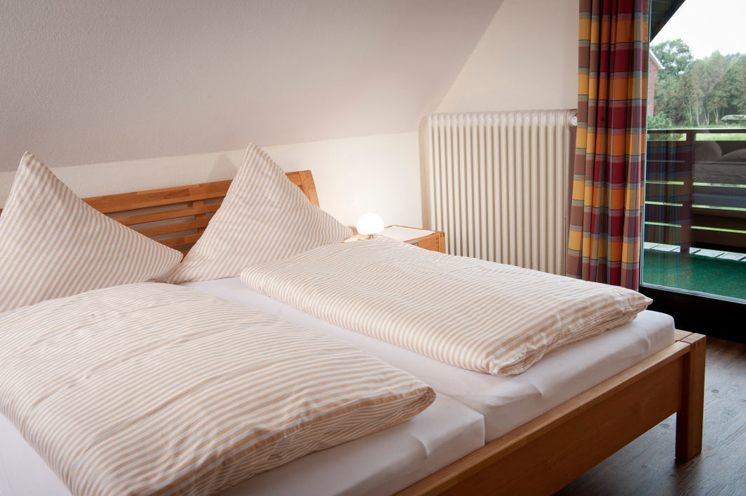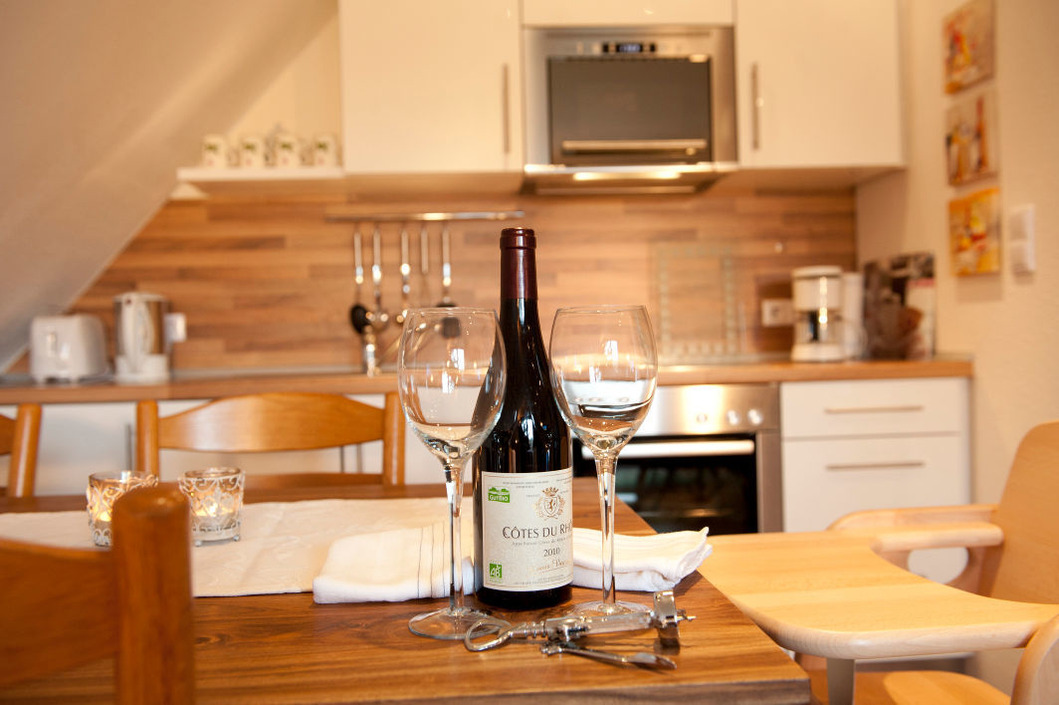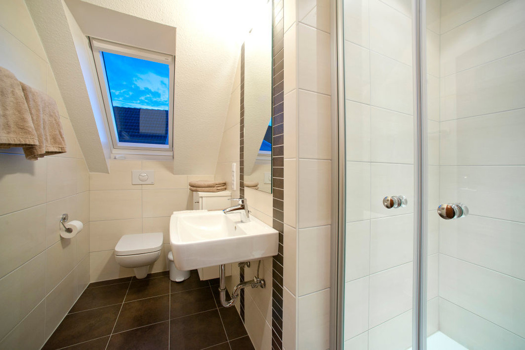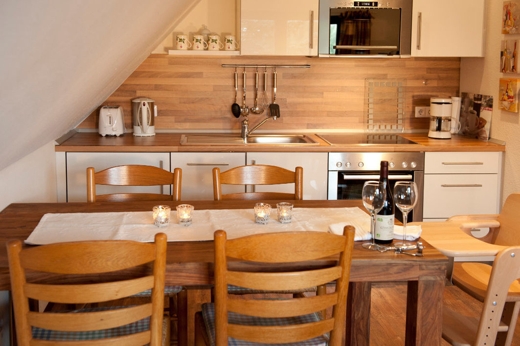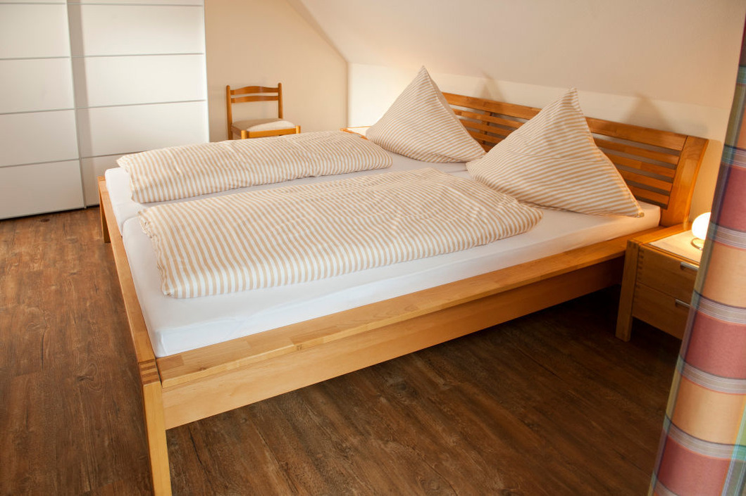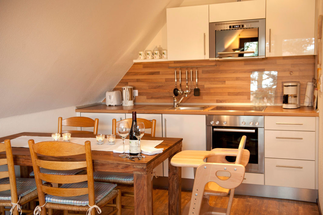 Die obere Ferienwohnung, ist 60 m² groß und hat zwei Schlafzimmer, eines mit einem Doppelbett und eines mit zwei Einzelbetten. Die Küche ist ausgestattet mit einer Spülmaschine, einem Koch-Ceranfeld mit Backofen, einer Mikrowelle, einem Kühlschrank mit Gefrierfach, einer Kaffeemaschine, einem Wasserkocher und vielem mehr. Sie finden hier einen großen Esstisch und in der Fernsehecke ein Sofa, zwei Korbsessel und einen Flachbildfernseher. Durch eine große Glastür gehen Sie von hier auf den Balkon mit Dachüberstand, wo Teakholzmöbel zum Verweilen einladen. Zugang zum Balkon hat man auch von einem der beiden Schlafzimmer. Im zweiten Schlafzimmer sowie im Bad finden Sie ein Dachfenster mit automatischen Jalousien, so dass man hier auch mittags im Dunkeln zur Ruhe kommen kann. Das Badezimmer wird Ihren Ansprüchen und Wünschen sicherlich gerecht werden.