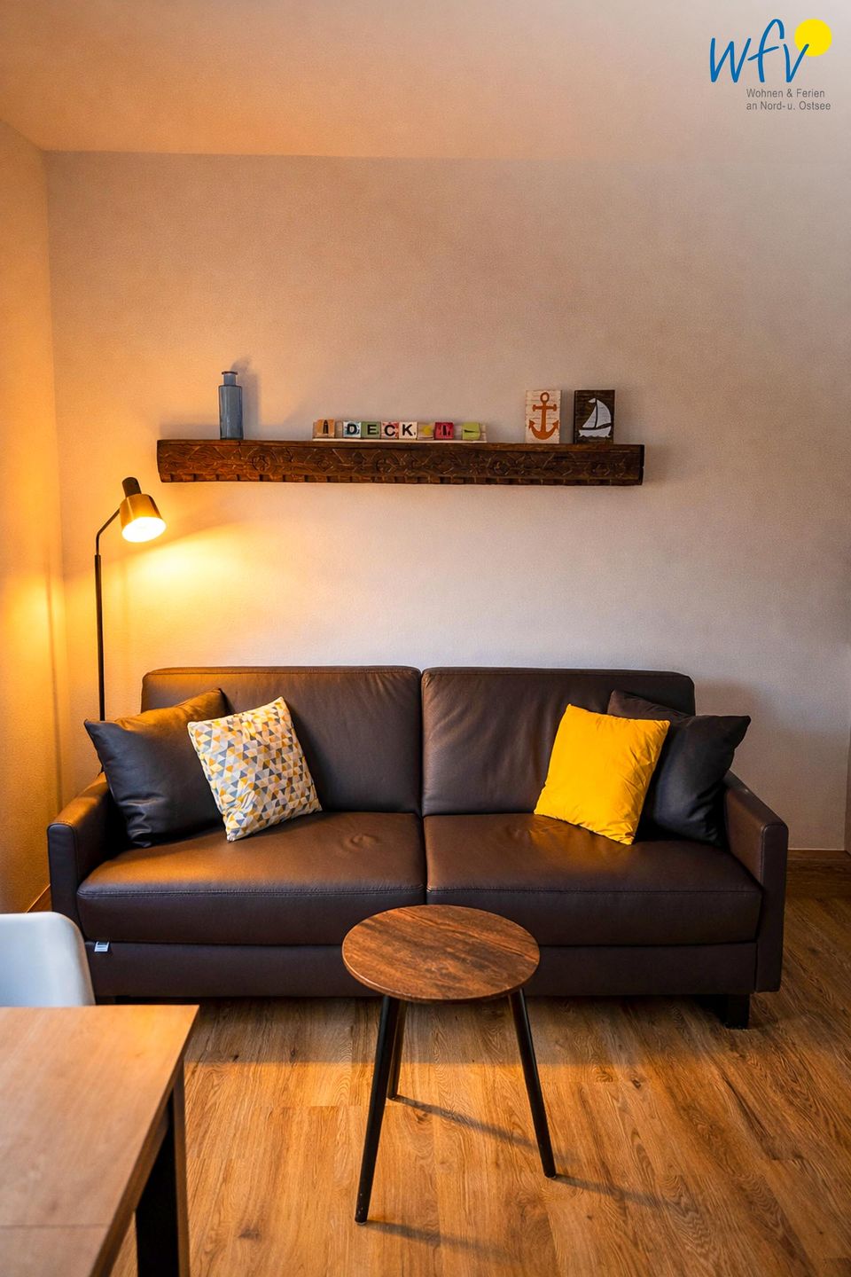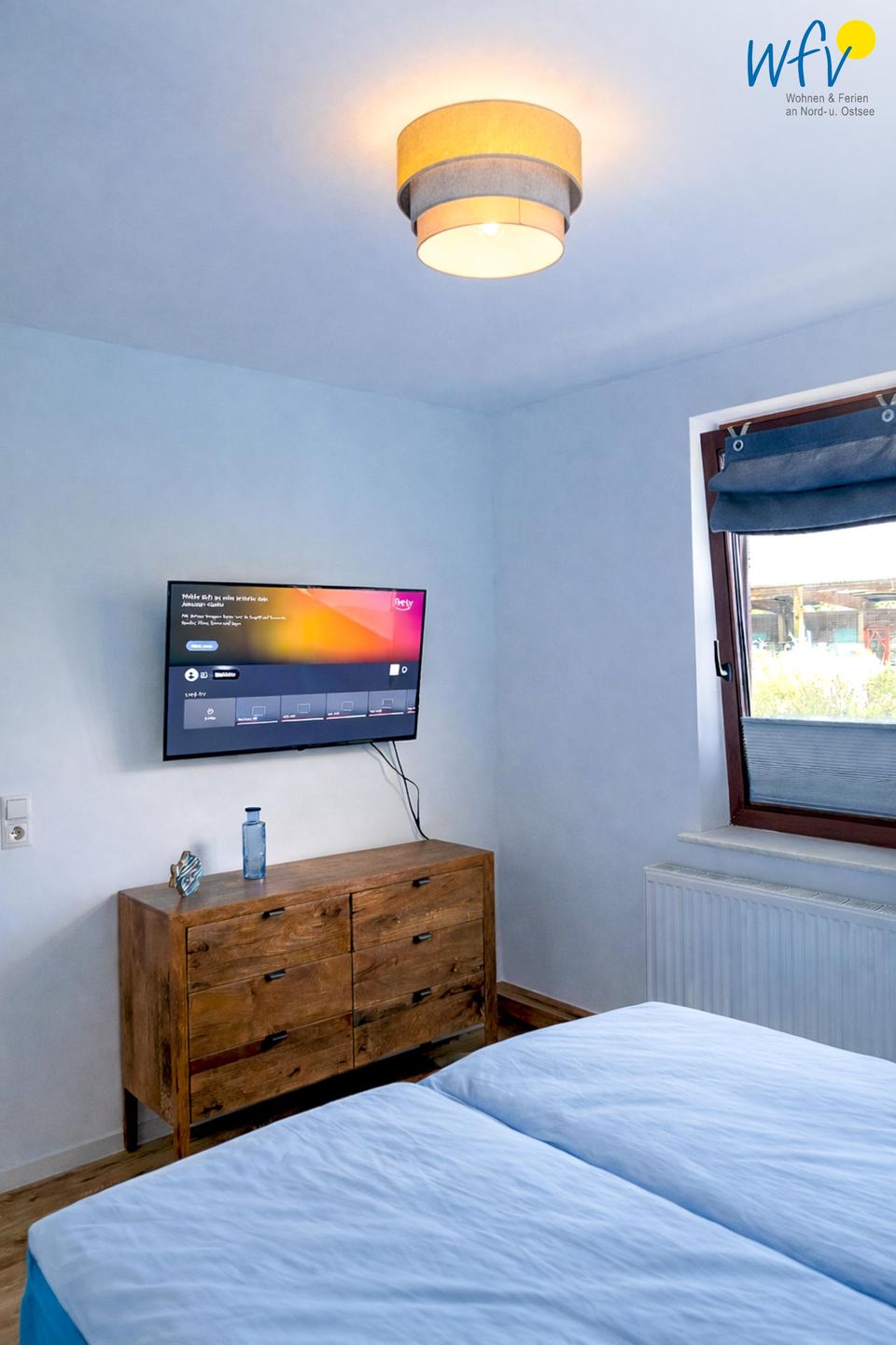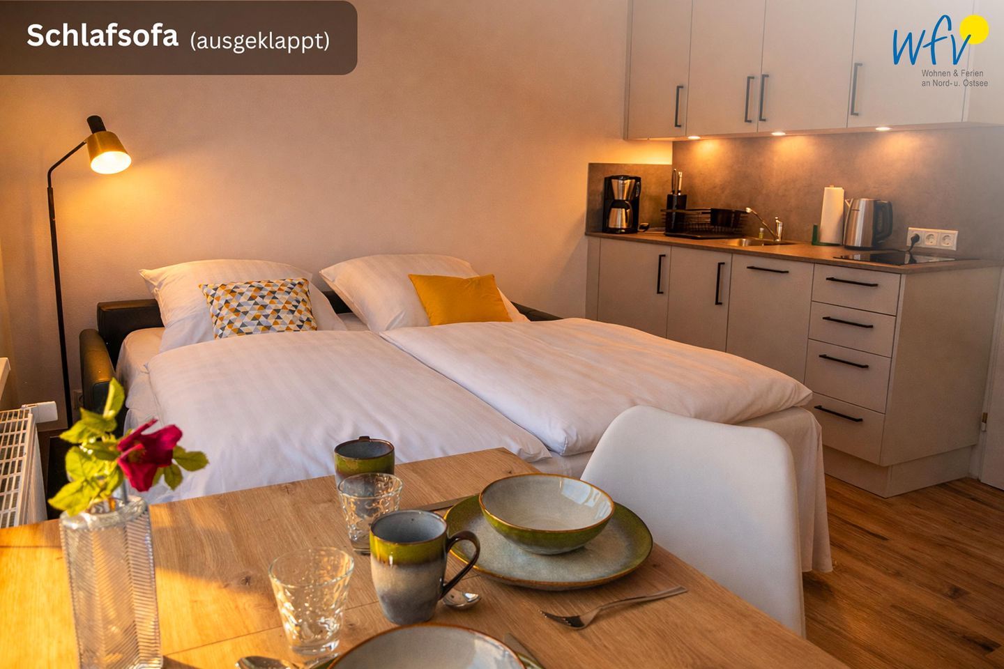 Im separaten Schlafzimmer erwartet Sie ein komfortables Boxspringbett (160 × 200 cm) sowie ausreichend Stauraum für Ihre Urlaubsgarderobe. Auch hier stehen Ihnen Smart-TV und WLAN zur Verfügung. Für Familien mit kleinem Kind ist im Schlafzimmer Platz für ein Reisebett, sodass der Wohnbereich frei bleibt und zum Spielen genutzt werden kann. Im Wohnraum lässt sich das hochwertige Sofa bei Bedarf schnell zu einem Schlafplatz mit echter Bettqualität für zwei weitere Personen ausklappen (160 × 200 cm). Tagsüber kann das Sofa ebenso unkompliziert wieder eingeklappt werden, sodass auch bei einer Belegung mit mehr als zwei Personen genügend Platz bleibt.