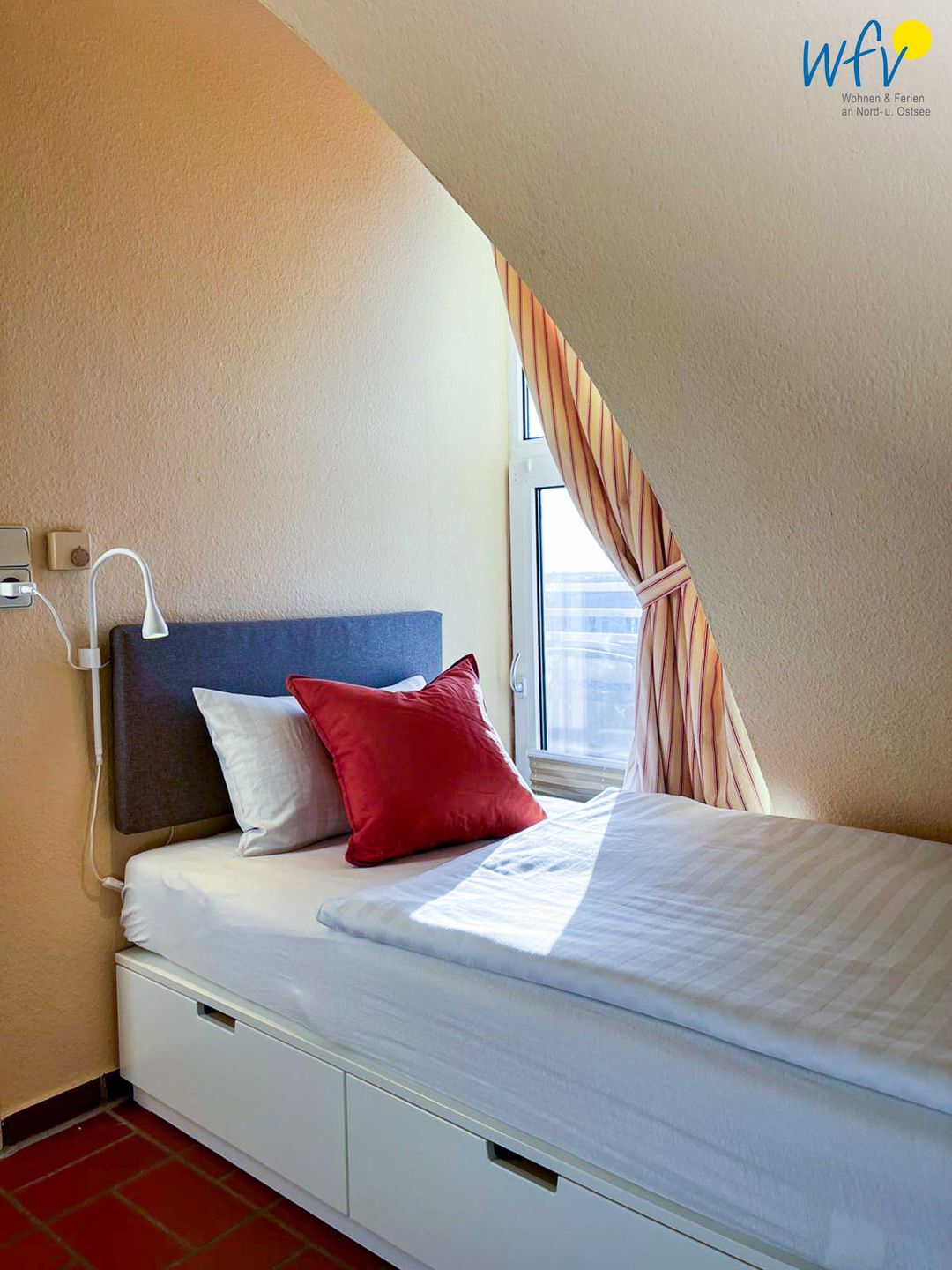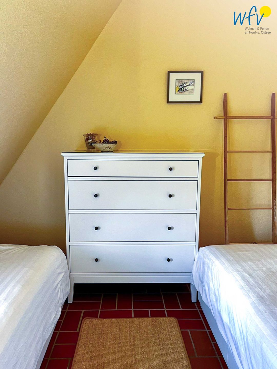 Das freundliche und kürzlich renovierte Schlafzimmer (2026) ist mit zwei komfortablen Einzelbetten eingerichtet (0,90 x 200 cm). Für Ihre Urlaubsgarderobe gibt es eine Kommode und eine Weitere im Flur. Kleidungsstücke, die aufgehängt werden, finden an der Leiter und an den Haken hinter der Tür Platz.