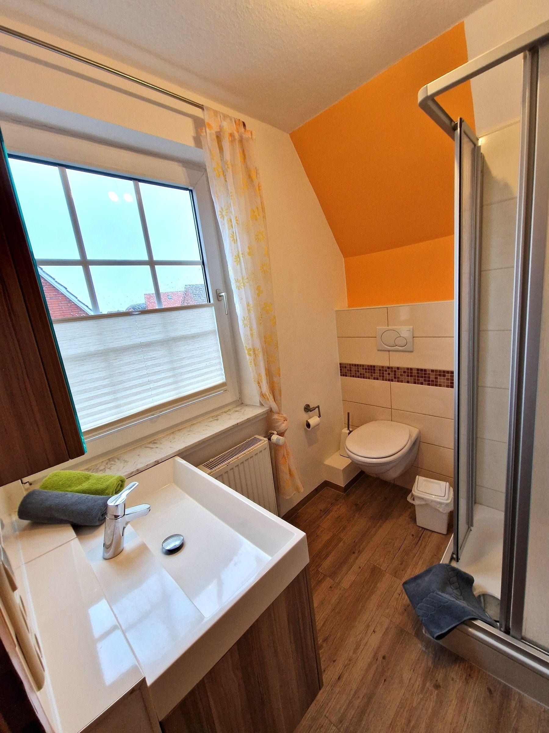 Das helle Badezimmer mit Fenster und Spiegel sorgt für zusätzlichen Komfort. Im Wohnbereich laden ein gemütliches Sofa und ein Esstisch zu entspannenden Stunden ein. Weiterhin ist die Ferienwohnung mit kostenlosem WLAN und einem TV ausgestattet. Ein Parkplatz steht ebenfalls zur Verfügung. Heizung und Staubsauger sorgen für einen angenehmen Aufenthalt. Die Kombination aus modernen Annehmlichkeiten und einem durchdachten Raumkonzept macht diese Ferienwohnung zu einem idealen Rückzugsort für jeden Gast.