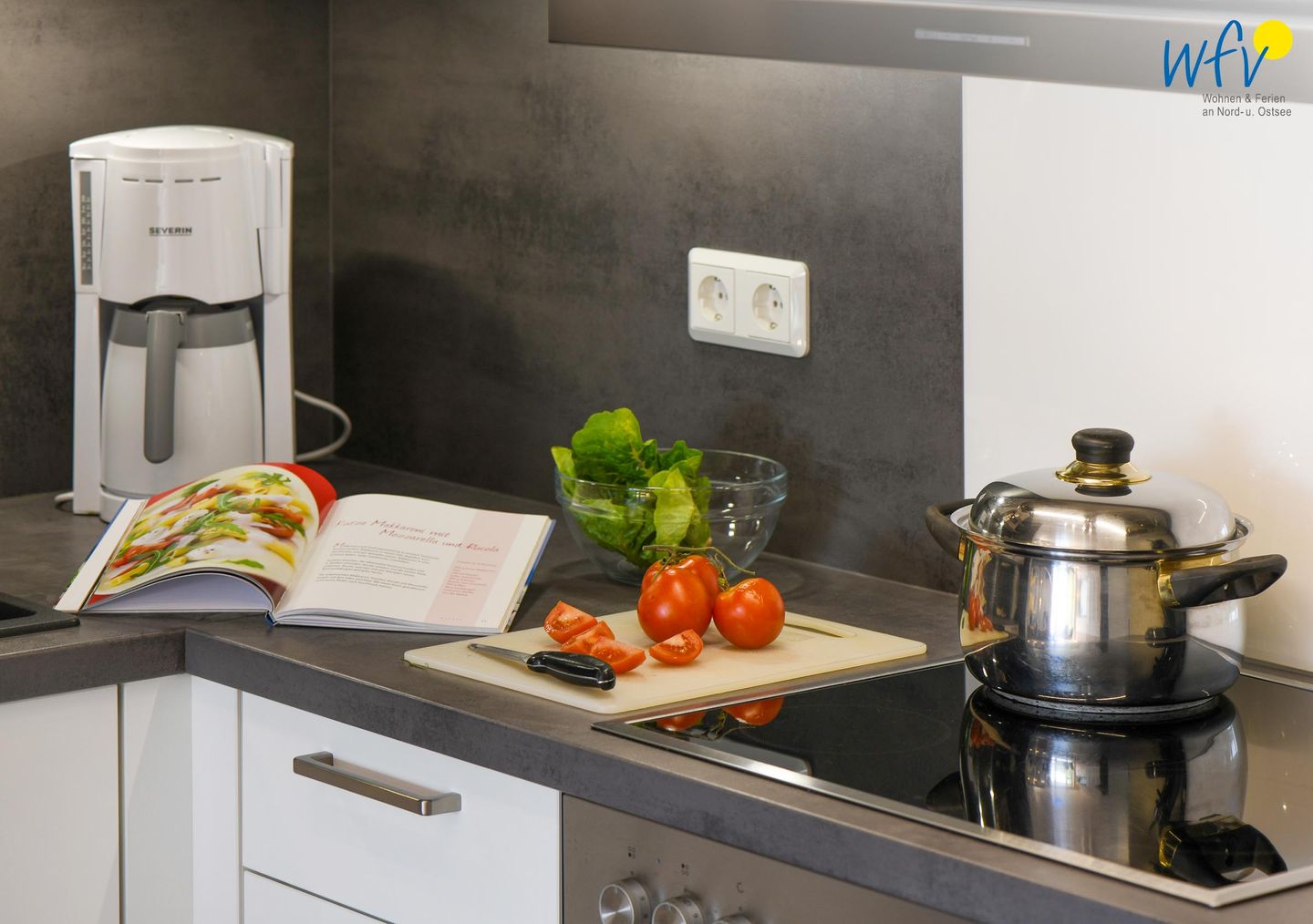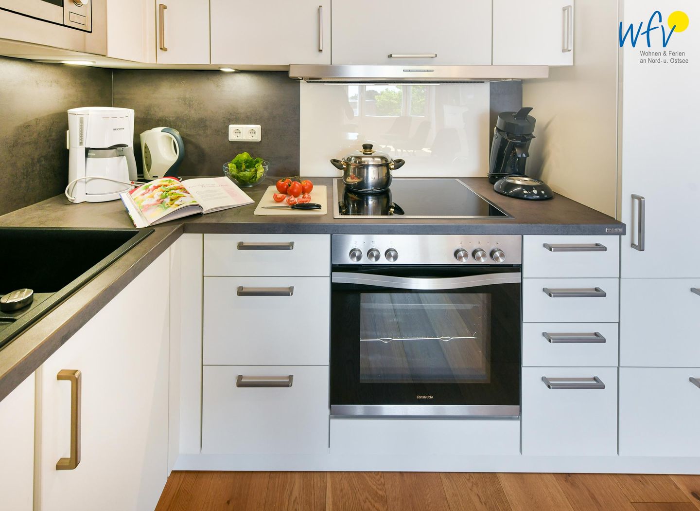 Für die bequeme Selbstverpflegung verfügt die Ferienwohnung über eine gut ausgestattete Küche – u.a. mit Ceranherd, Backofen, Mikrowelle und Geschirrspüler. Eine klassische Kaffeemaschine und eine Senseo machen den Morgenkaffee zum Genuss!