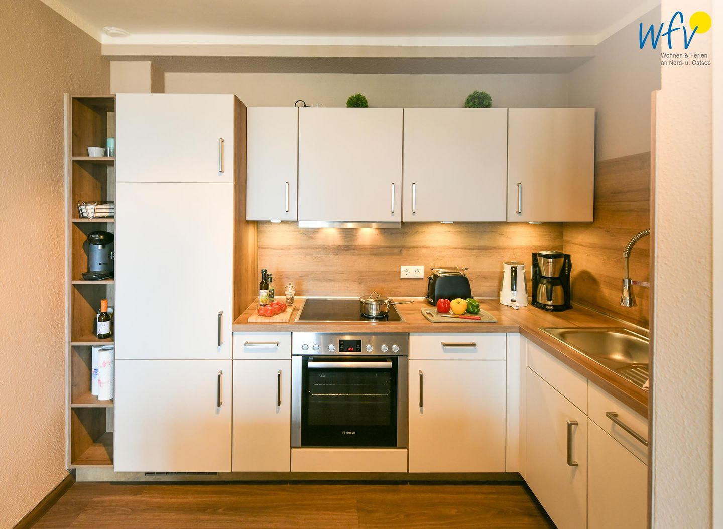 Bereits beim Ferienfrühstück beginnen Sie den Urlaubstag mit einem herrlichen Ausblick aufs Meer. In Gedanken wird schon die Badetasche gepackt oder der Rucksack für den Strandspaziergang. Warme Frühstücksbrötchen, kleine Snacks für den Ausflug und leckere Mahlzeiten lassen sich in der modernen offenen Küchenzeile zubereiten. Hochwertige Geräte wie ein Ceran-Herd, ein Backofen, ein Racletteeisen, eine Mikrowelle, ein Kühlschrank mit Gefrierfach und ein Geschirrspüler ermöglichen Ihnen hier eine bequeme Selbstverpflegung und gemeinsame Kochabende.