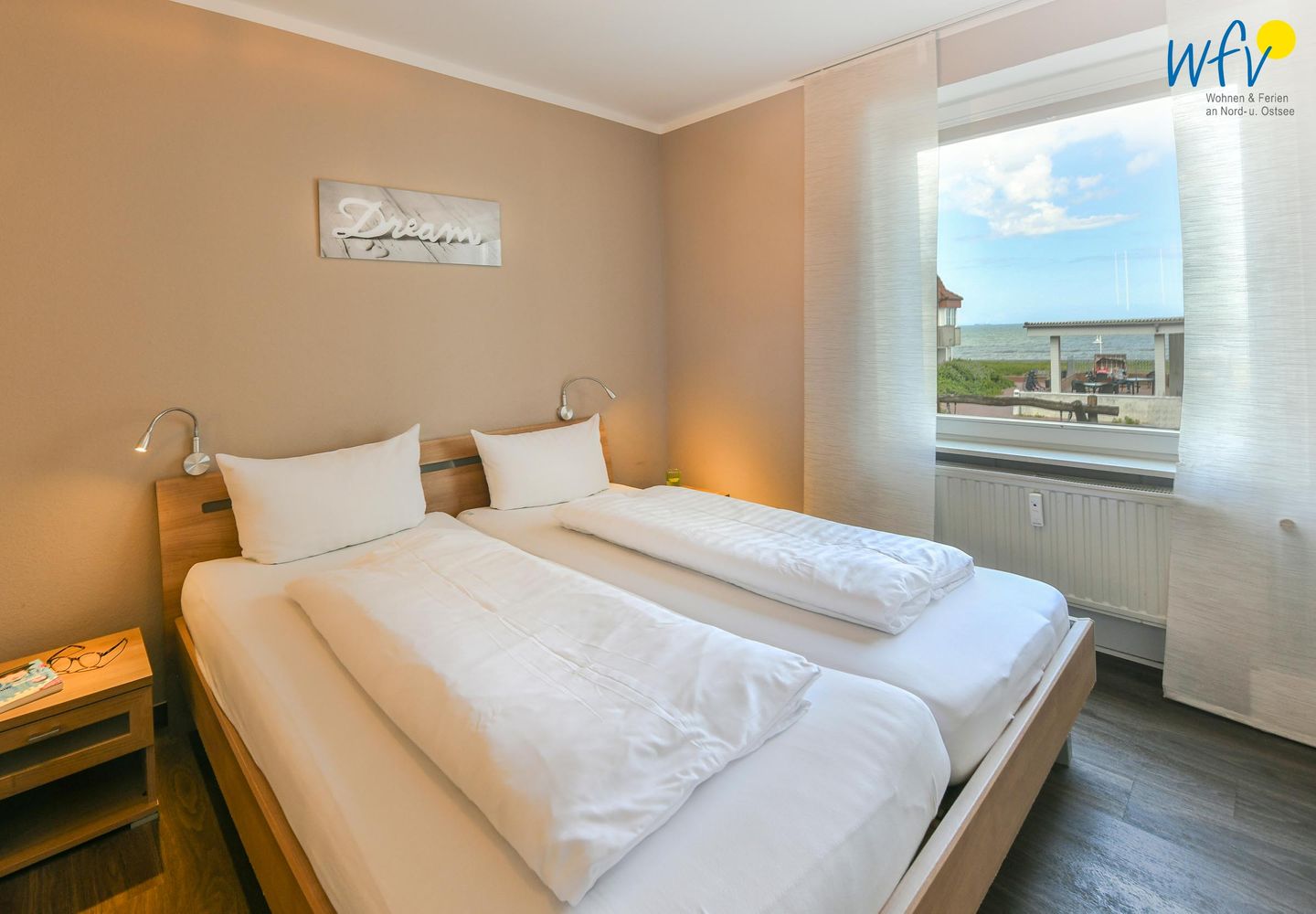 Wenn auf Wangerooge die Sonne untergeht, bieten Ihnen die zwei separaten Schlafzimmer einen wohligen Rückzugsort. Eines der Schlafzimmer ist mit einem Doppelbett ausgestattet (180 cm x 200 cm), das andere mit einem Etagenbett. Auch von diesen Räumen aus haben Sie einen schönen Meerblick. Zwei weitere Personen finden auf einem gemütlichen Schrankbett Platz, welches ganz einfach zur Schlafmöglichkeit ausgeklappt werden kann (140 cm x 200 cm).