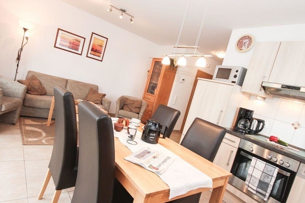 An den Küchenbereich mit vollausgestatteter Einbauküche (Mikrowelle, Geschirrspüler, Kühlschrank mit Eisfach, Toaster, Kaffeemaschine, Wasserkocher…) schließt sich mit einem Tisch und vier Stühlen der Essbereich an. Im Wohnzimmer können Sie es sich auf der hochwertigen Schlafcouch( Liegefläche 2,12 x1,50 m) oder auf den Sesseln gemütlich machen und auf dem großen Flachbildschirm-TV einen schönen Spielfilm ansehen.
