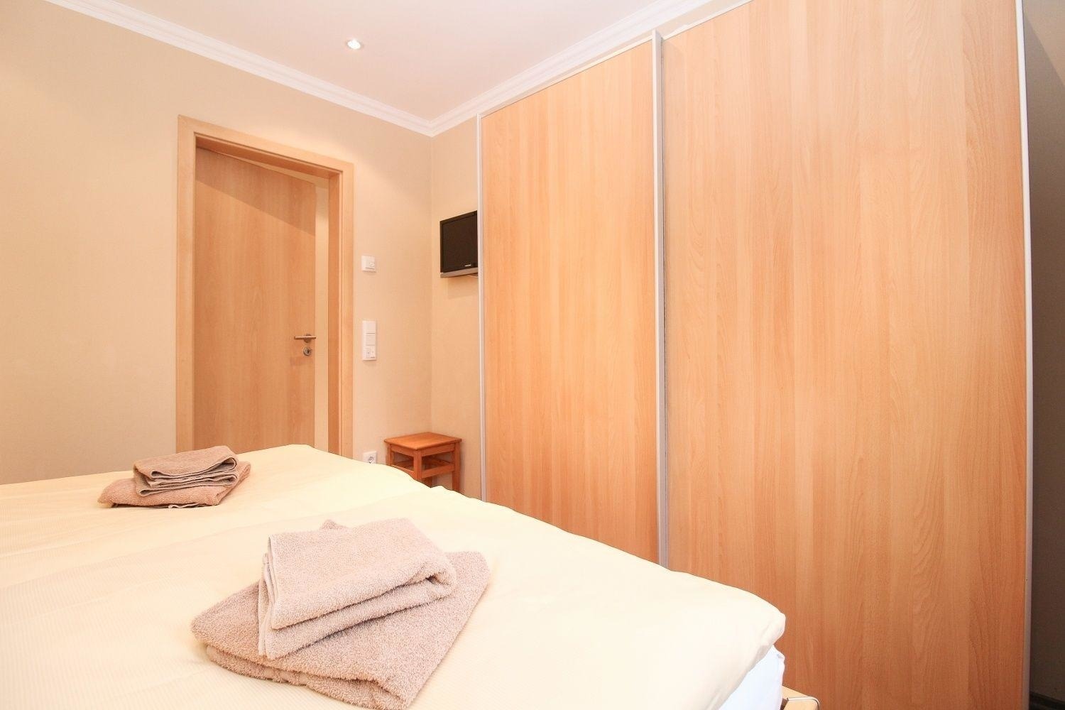 Im Elternschlafzimmer gibt es neben einem Doppelbett(1,80×2,00), Nachtkonsolen und Kleiderschrank einen Flachbildschirm-TV.