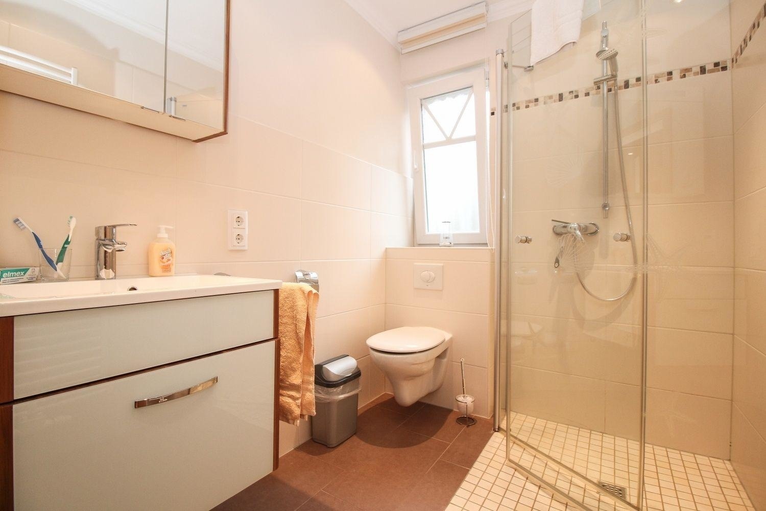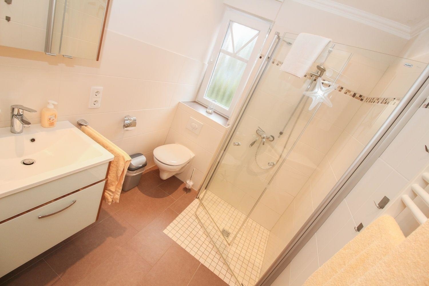 Die Fußbodenheizung sorgt in der gesamten Wohnung für angenehm warme Füße. So auch im modernen Badezimmer mit bodentiefer Dusche, WC, Waschbecken und Handtuchwärmer. Für die Männer gibt es ein Gäste-WC mit Urinal.