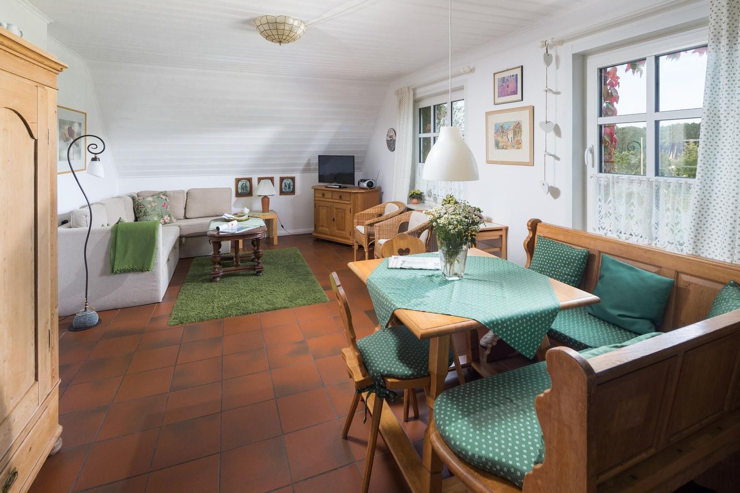 Die Wohnung selbst ist rustikal und gemütlich eingerichtet. Sie verfügt über ein Schlafzimmer mit Doppelbett, ein Wohnzimmer mit integrierter Küchenzeile und einen Essbereich. Das Badezimmer ist mit einer Dusche und WC ausgestattet. Hier darf auch der vierbeinige Freund mitkommen, denn die Ferienwohnung heißt auch Hunde herzlich willkommen. Erlaubt ist maximal 1 Hund (Höhe maximal kniehoch). Die Hundewiese befindet sich in der Nähe des Fährhafens (kein Leinenzwang).
