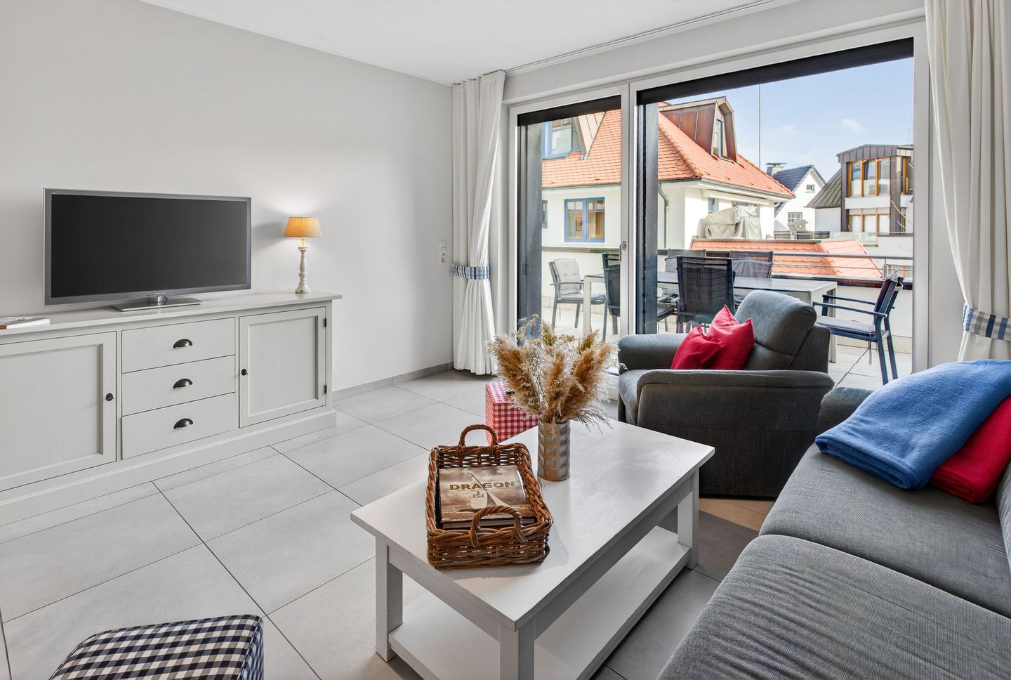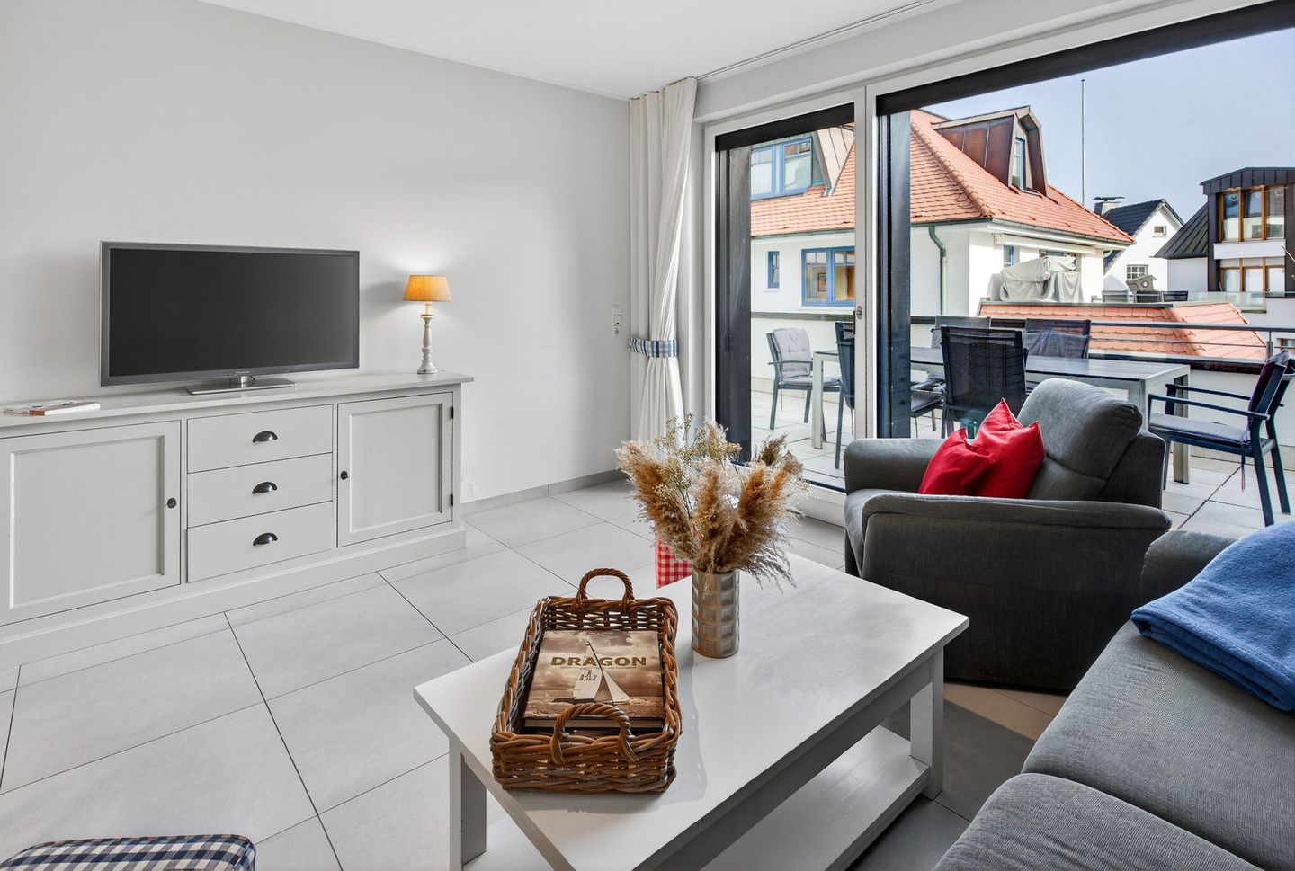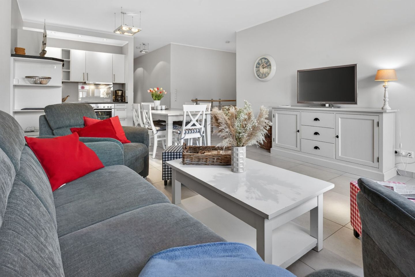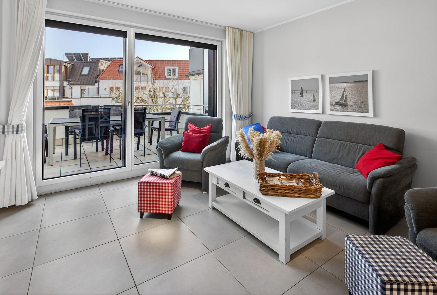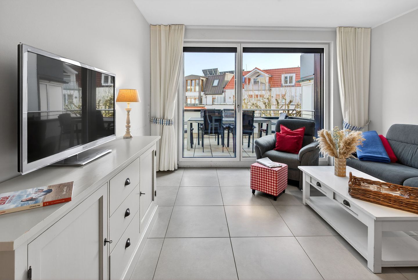Die Wohnung bietet mit drei Schlafzimmern, zwei Balkonen und zwei Bädern ausreichend Platz für bis zu sechs Personen. Die Wohnfläche beträgt ca. 103 Quadratmeter und wird durch die Terrasse (ca. 20 Quadratmeter) ergänzt. Im Hochparterre liegt das Wohnzimmer mit integrierter Küchenzeile und Zugang zum Balkon. Zudem sind auf dieser Etage ein Schlafzimmer, ein Bad mit Dusche und ein separates Gäste-WC. Im Untergeschoss sind zwei weitere Schlafzimmer, eine Terrasse, ein Abstellraum und ein weiteres Bad mit Dusche und WC vorhanden. Eine Waschmaschine und ein Wäschetrockner stehen (für die gemeinschaftliche Nutzung) gegen Münzeinwurf zur Verfügung. Fahrräder können im Keller abgestellt werden. Hunde sind in dieser Ferienwohnung nicht erlaubt.