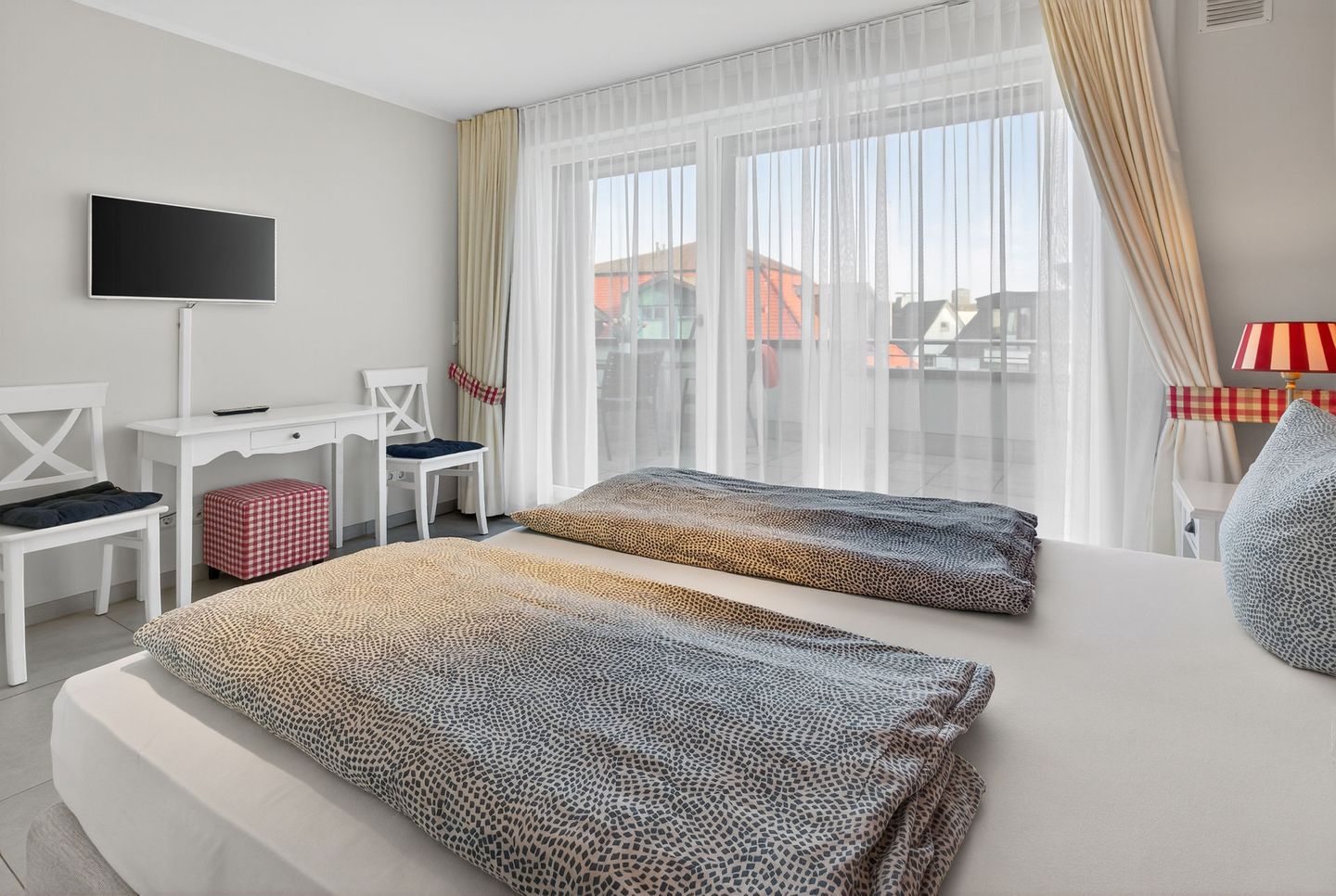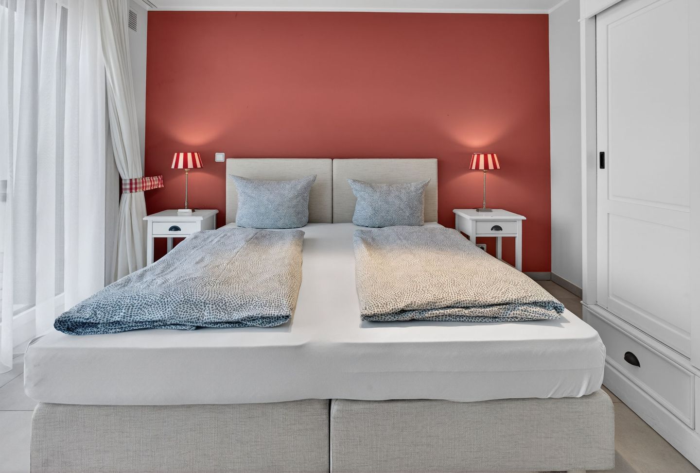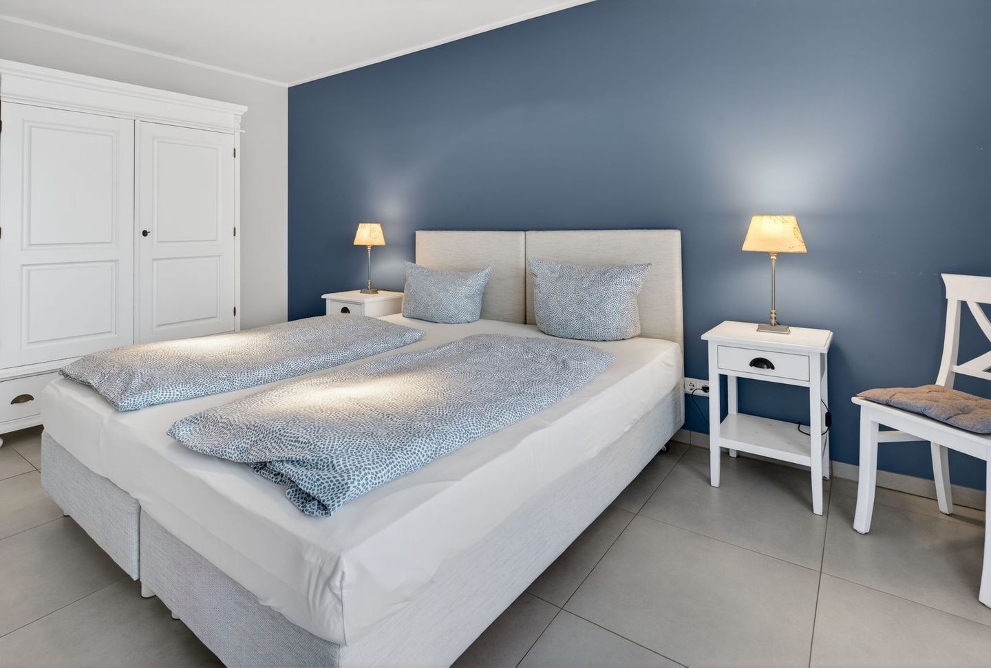 Die Wohnung bietet auf einer Wohnfläche von 79qm, ergänzt durch zwei Balkone (insgesamt 17,5qm), ausreichend Platz für 4 Personen. Bei der Inneneinrichtung wurde auf helle Farben und natürliche Materialien Wert gelegt. Die Wohnung verfügt über zwei Schlafzimmer (jeweils mit einem Doppelbett eingerichtet), ein Wohnzimmer mit offener Küche und einem Essbereich sowie ein Badezimmer mit einer Dusche, WC und zwei Handwaschbecken. Eine Waschmaschine und ein Wäschetrockner stehen (für die gemeinschaftliche Nutzung) gegen Münzeinwurf zur Verfügung. Fahrräder können im Keller abgestellt werden. Hunde sind in dieser Ferienwohnung nicht erlaubt.