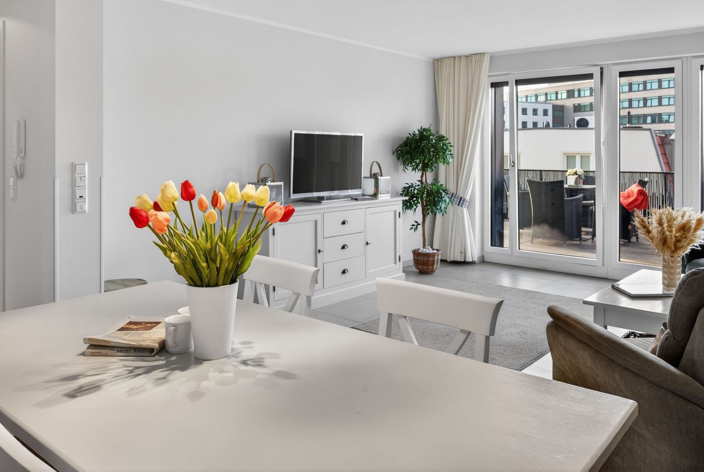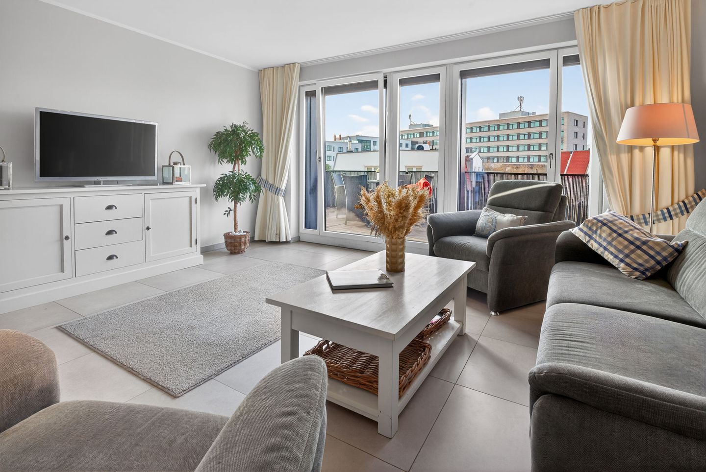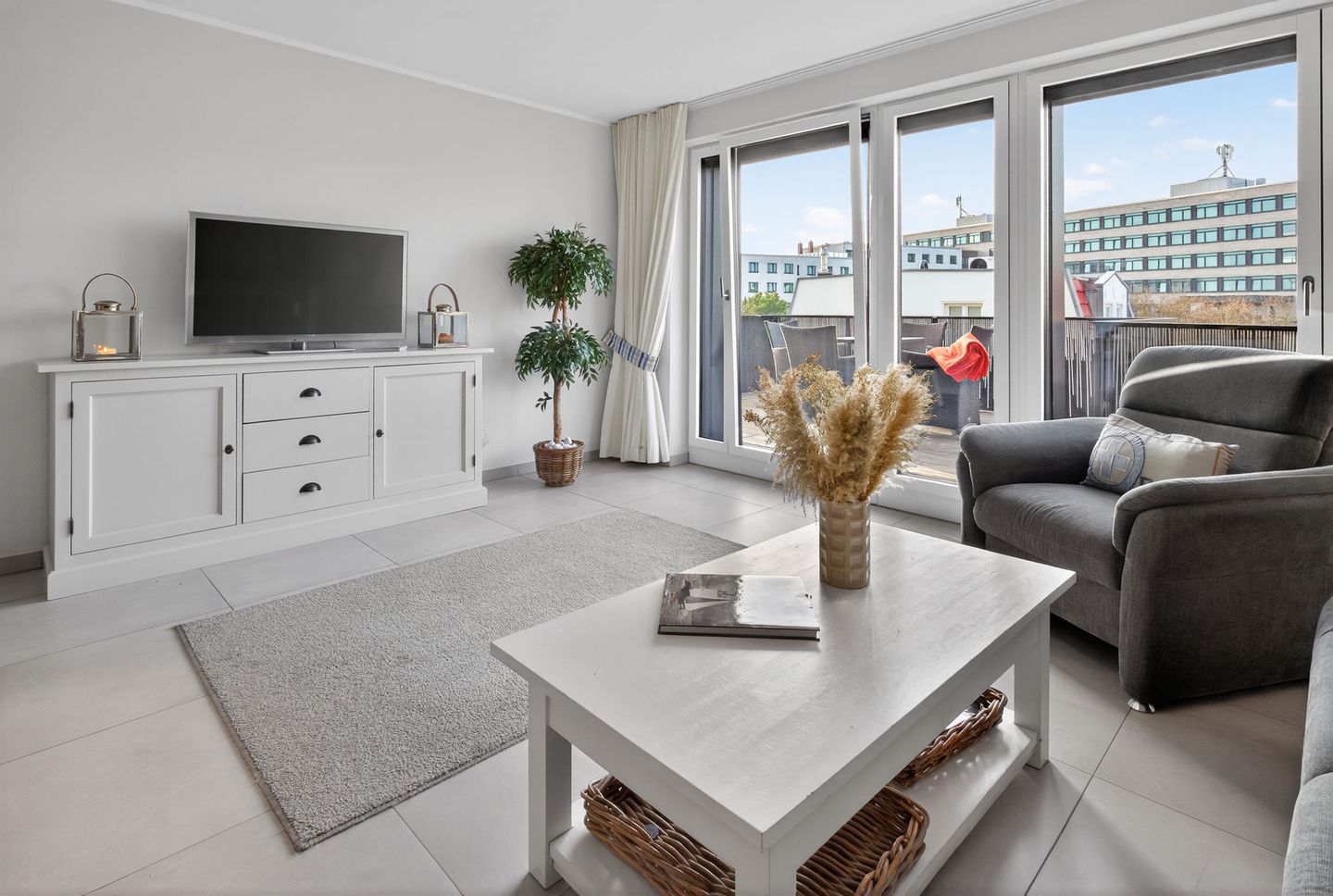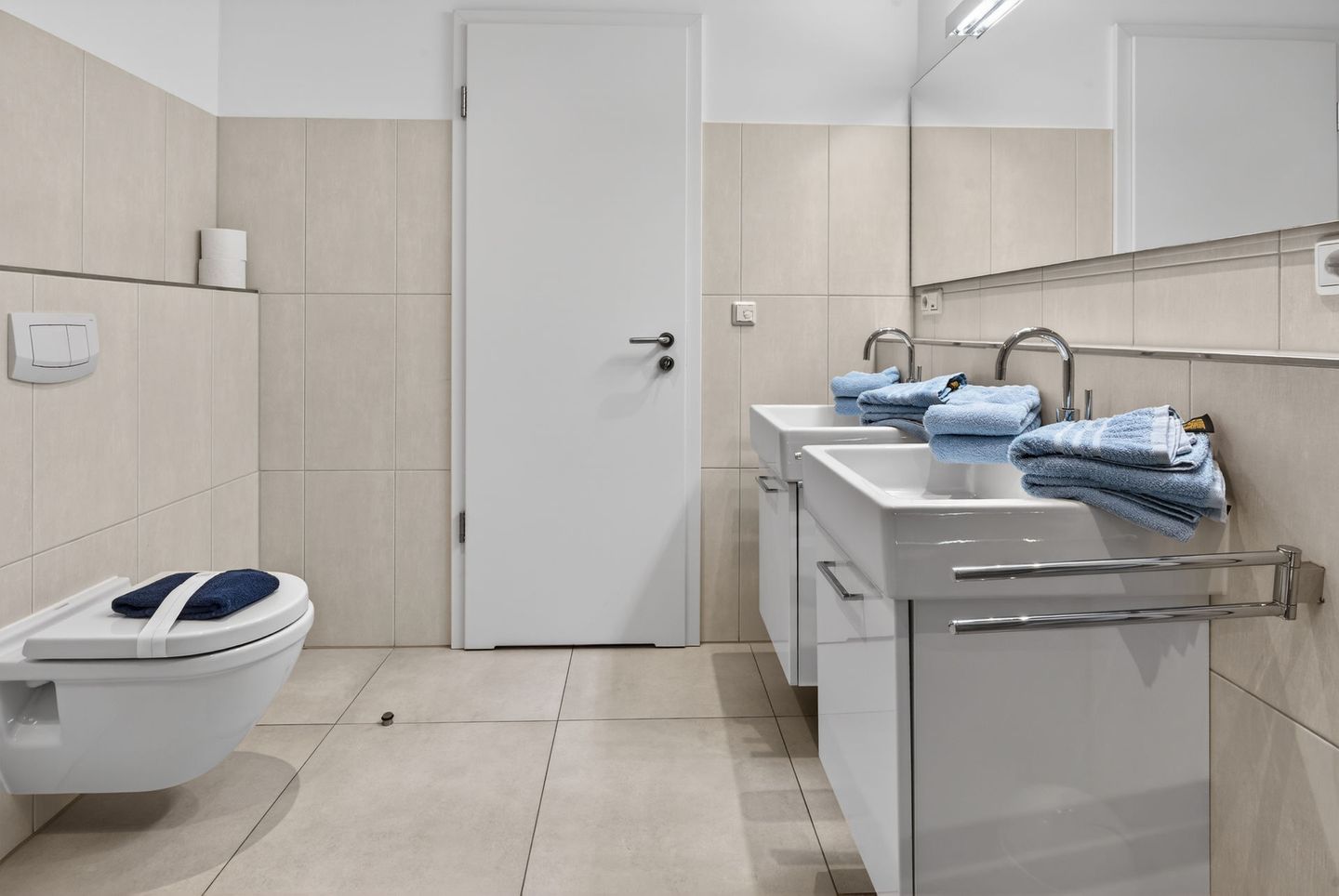 Die Wohnung bietet auf einer Wohnfläche von 79qm, ergänzt durch zwei Balkone (insgesamt 17,5qm), ausreichend Platz für 4 Personen. Bei der Inneneinrichtung wurde auf helle Farben und natürliche Materialien Wert gelegt. Die Wohnung verfügt über zwei Schlafzimmer (jeweils mit einem Doppelbett eingerichtet), ein Wohnzimmer mit offener Küche und einem Essbereich sowie ein Badezimmer mit einer Dusche, WC und zwei Handwaschbecken. Eine Waschmaschine und ein Wäschetrockner stehen (für die gemeinschaftliche Nutzung) gegen Münzeinwurf zur Verfügung. Fahrräder können im Keller abgestellt werden. Hunde sind in dieser Ferienwohnung nicht erlaubt.