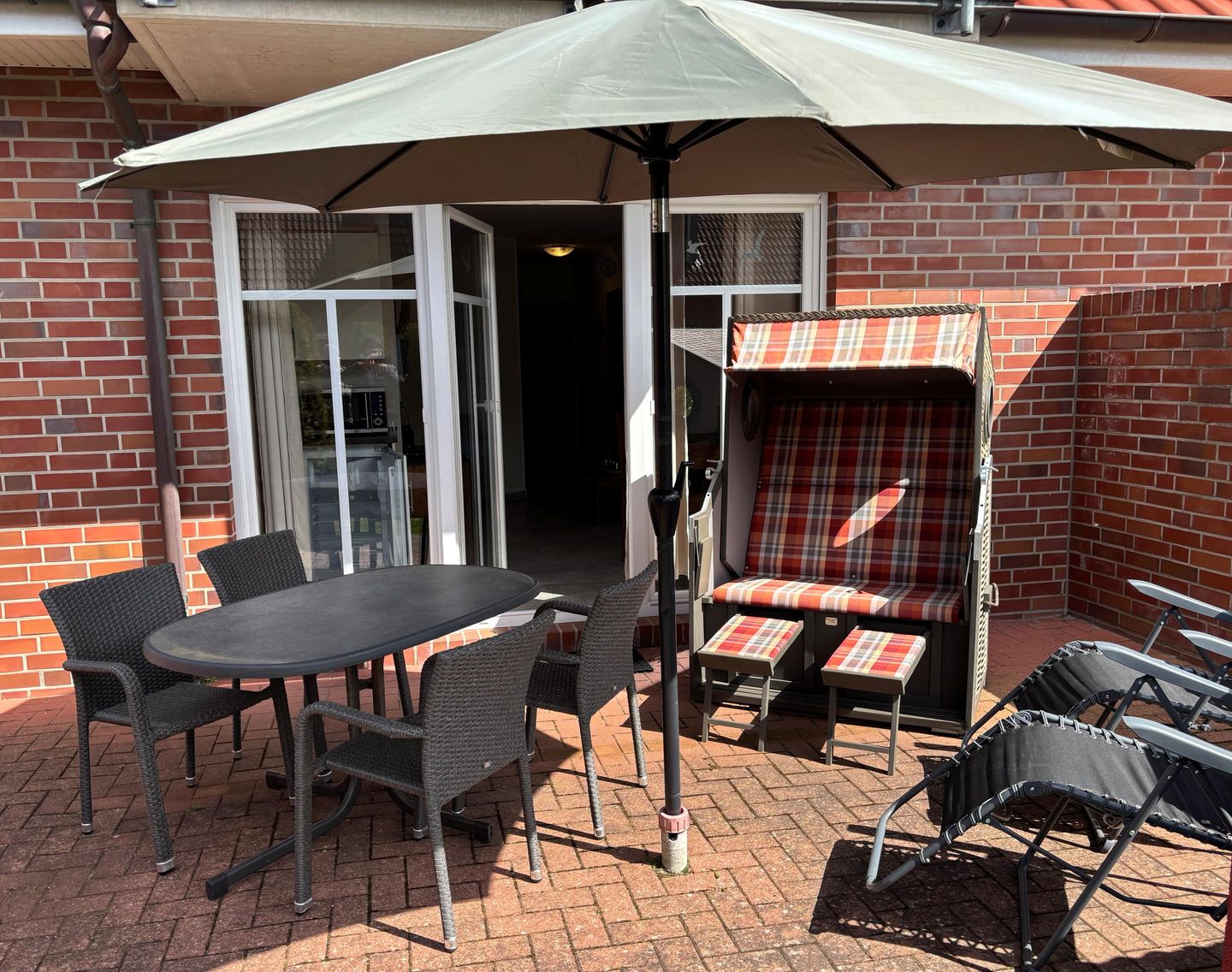 Auf der Terrasse steht ein Strandkorb und es gibt Gartenmöbel sowie einen Sonnenschirm. Der Garten ist umzäunt und liegt in einer Sackgasse. Für das Auto steht ein Privatparkplatz direkt am Haus zur Verfügung.