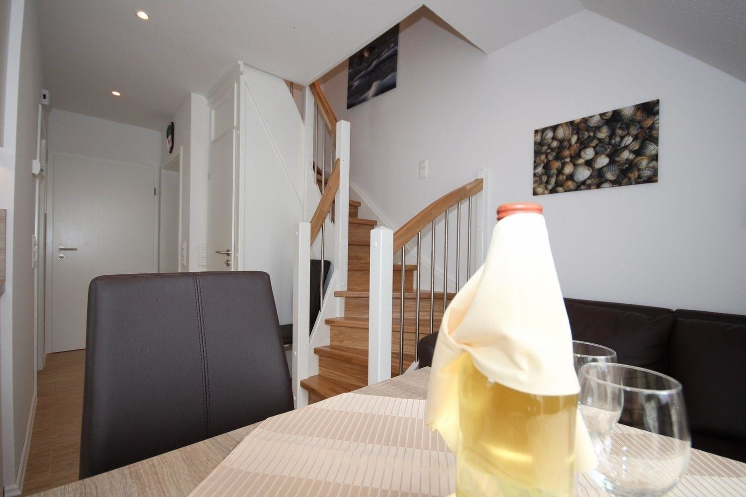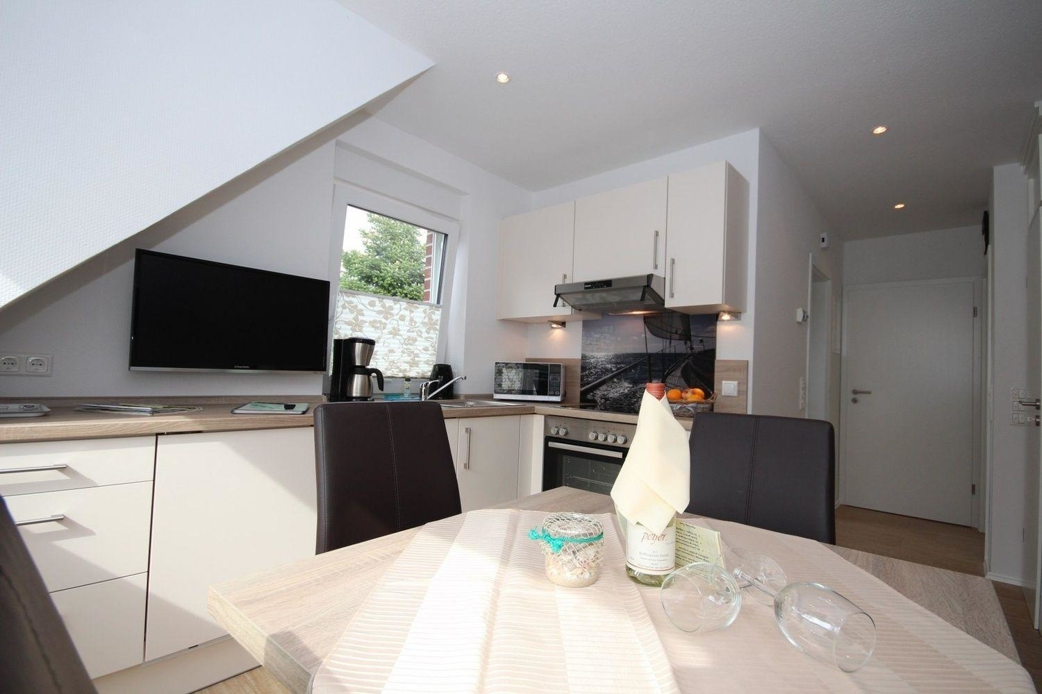 Im Wohnbereich stehen Ihnen eine hochwertige Ledermöbel sowie ein großer Flachbildschirm-TV, WLAN und ein Radio mit MP3 Anschluss zur Verfügung. An den Wohnbereich schließt sich der Küchenbereich mit einer hochwertigen Einbauküche mit Geschirrspüler, Kühlschrank mit Gefrierfach, Backofen, Toaster, Ceranfeld, Wasserkocher, Kaffeemaschine und einem Esstisch mit 4 Schwingstühlen an.