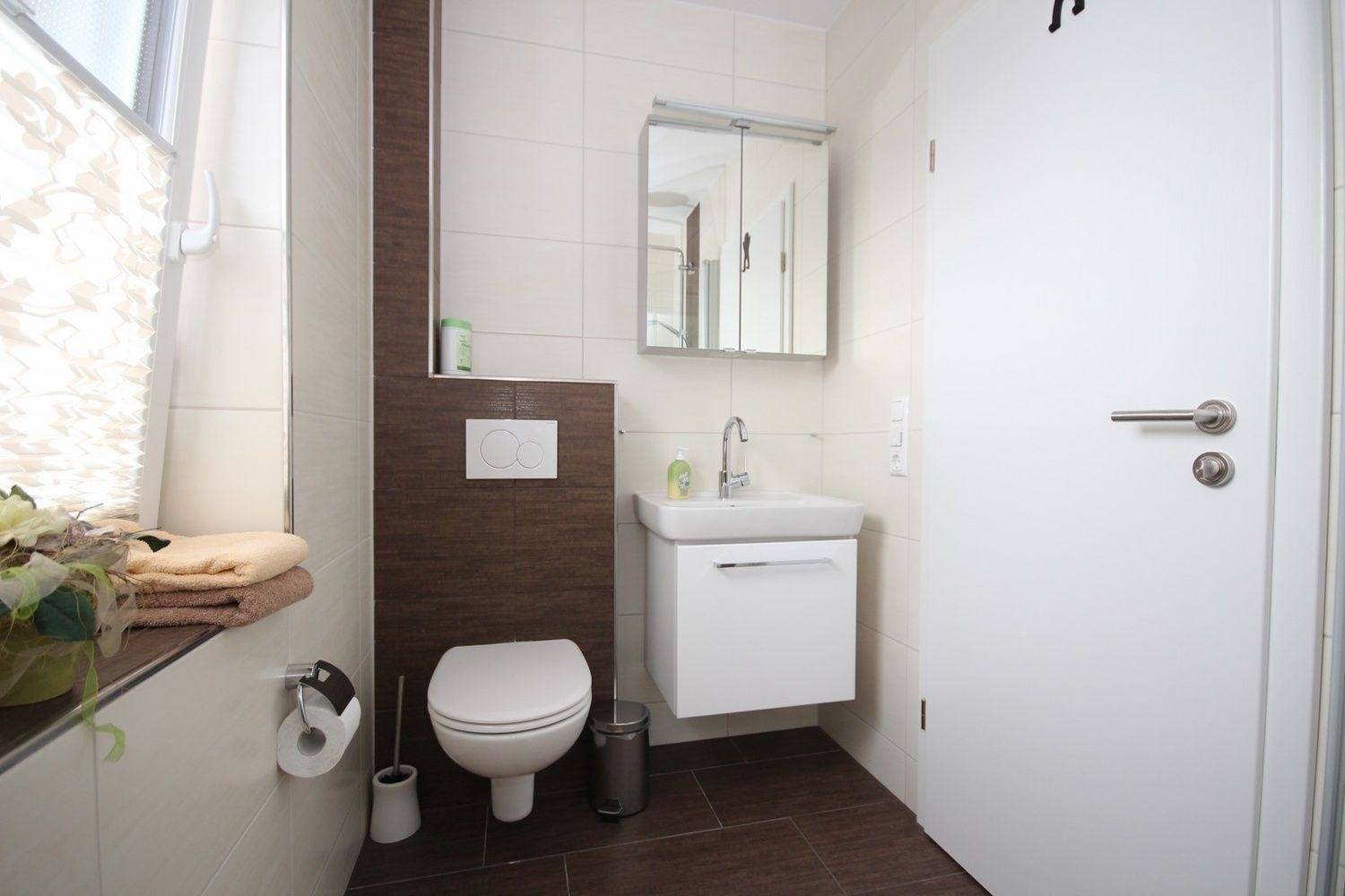 Das moderne Badezimmer mit großem Fenster bietet Ihnen neben einer bodentiefen Dusche mit Rainshower-Duschkopf, ein Waschbecken, ein Fön und WC.