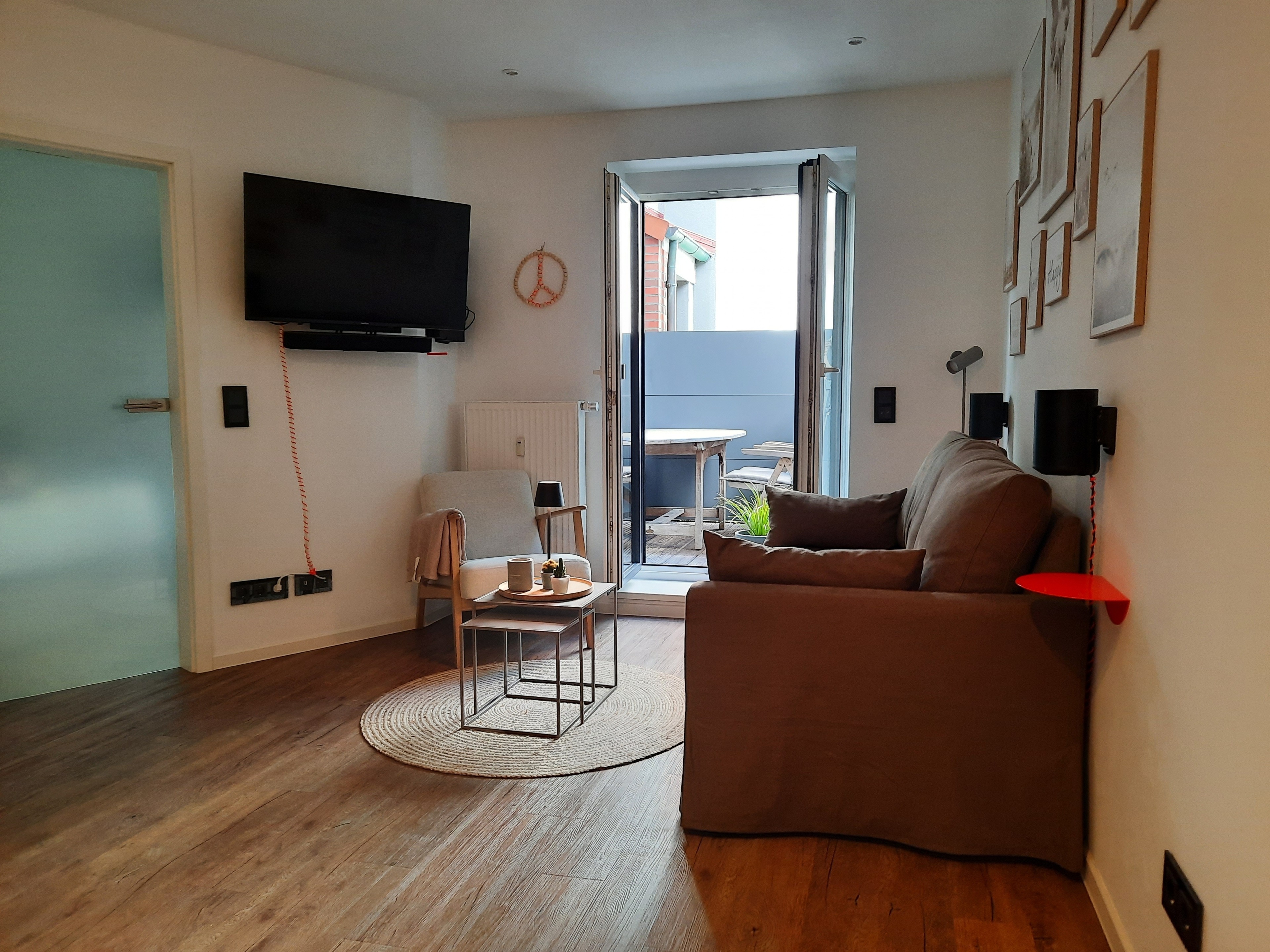 Ebenso wie im Schlafzimmer lässt sich das bodentiefe Fenster komplett öffnen, so dass man auch von hier aus auf die Terrasse gelangt.
