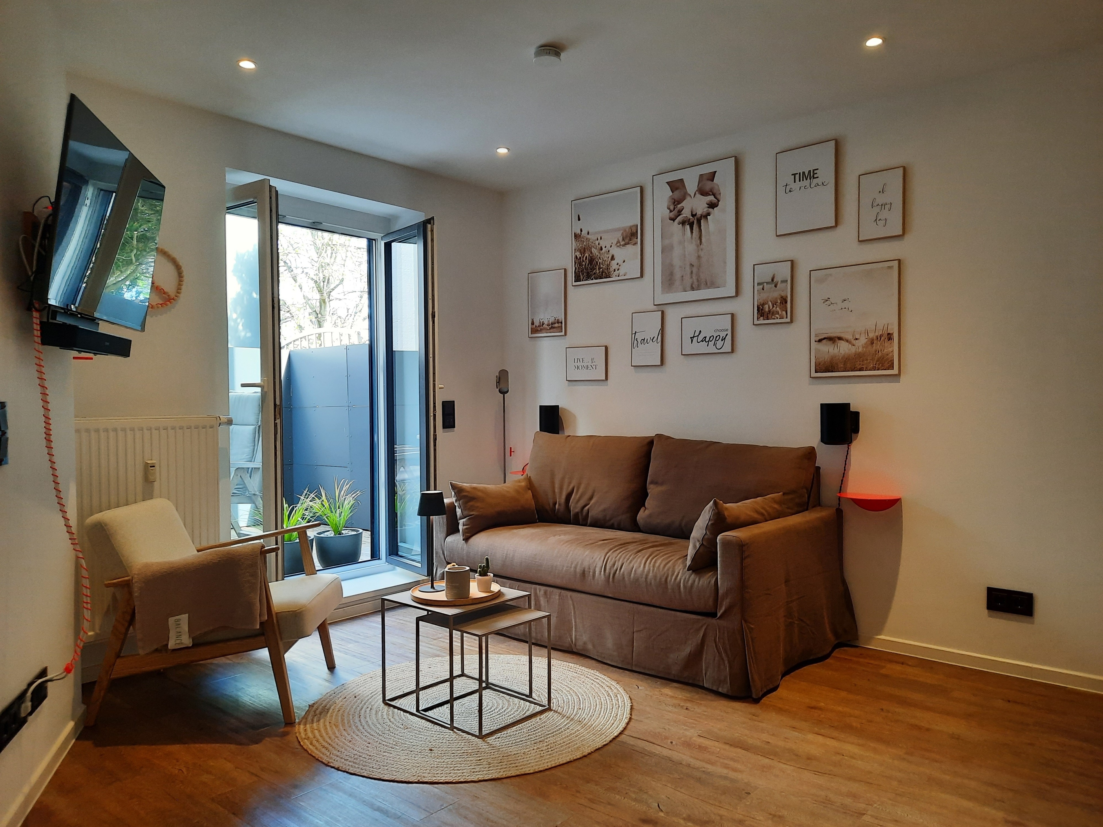 Das Schlafzimmer verfügt über ein Boxspringbrett in der Größe 1,60 m x 2,00 m und zwei Kleiderschränken. Vom Bett aus kann man bequem den Smart-TV inkl. Sonos-Soundbar an der gegenüberliegenden Wand nutzen. Das bodentiefe Fenster lässt sich komplett öffnen und führt zur Terrasse.