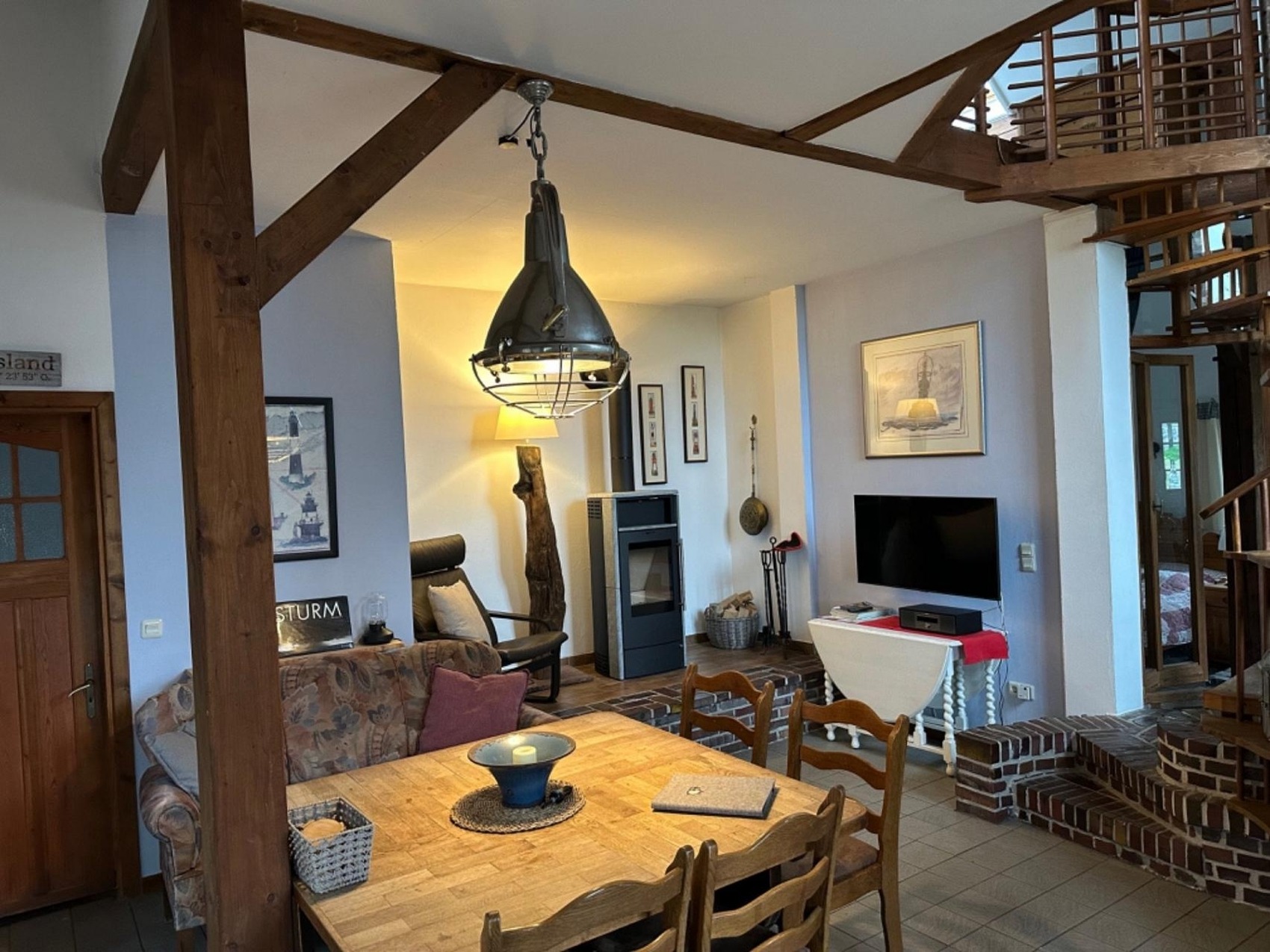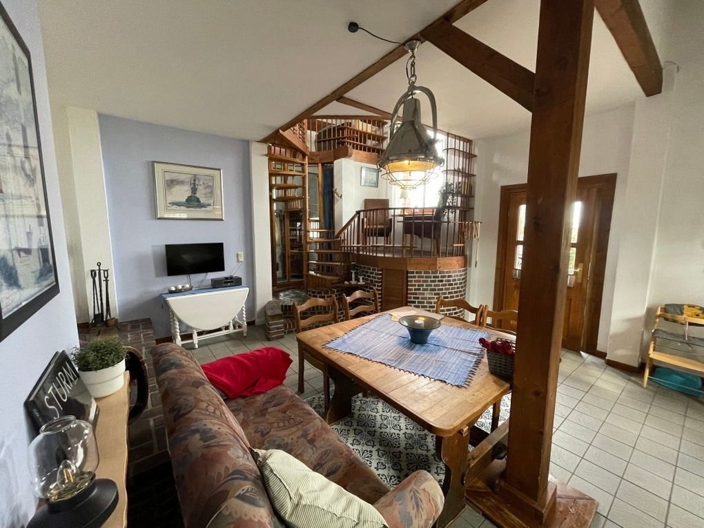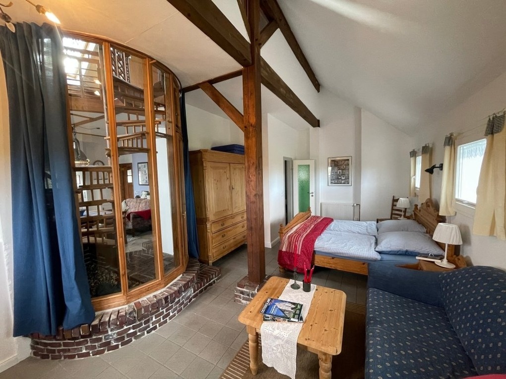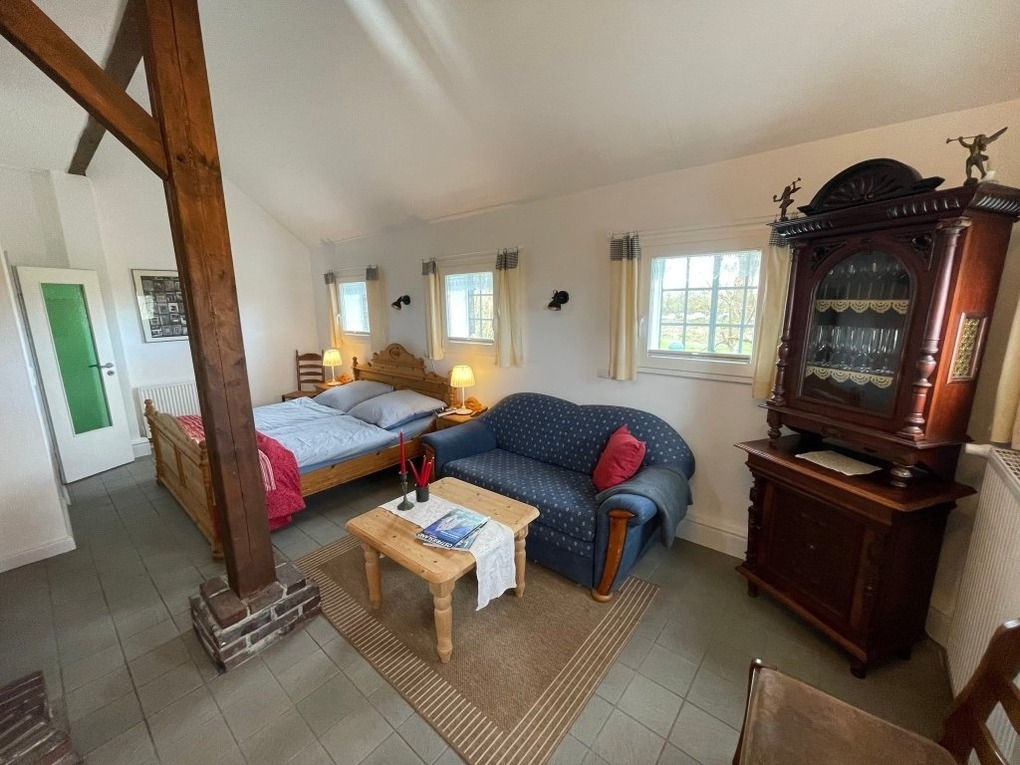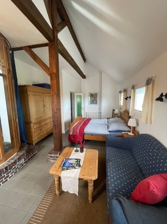 Die ca. 104 qm2 große Wohnung Störtebecker liegt im vorderenTeil des Hauses. Im urigen Wohn- und Kochbereich im Erdgeschoss ist das historische Balkenkonstrukt erhalten worden. Echte Wohlfühlatmosphäre schaffen der Kaminofen und die Empore mit Ausblick über die Wiesen und Weiden der Umgebung.