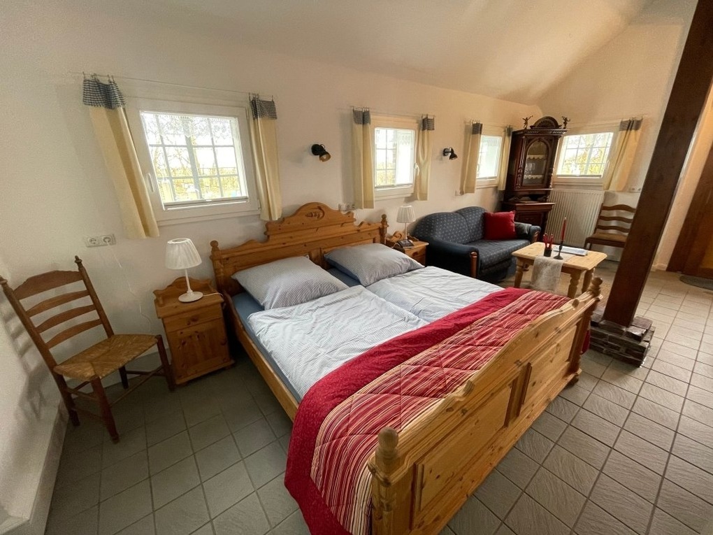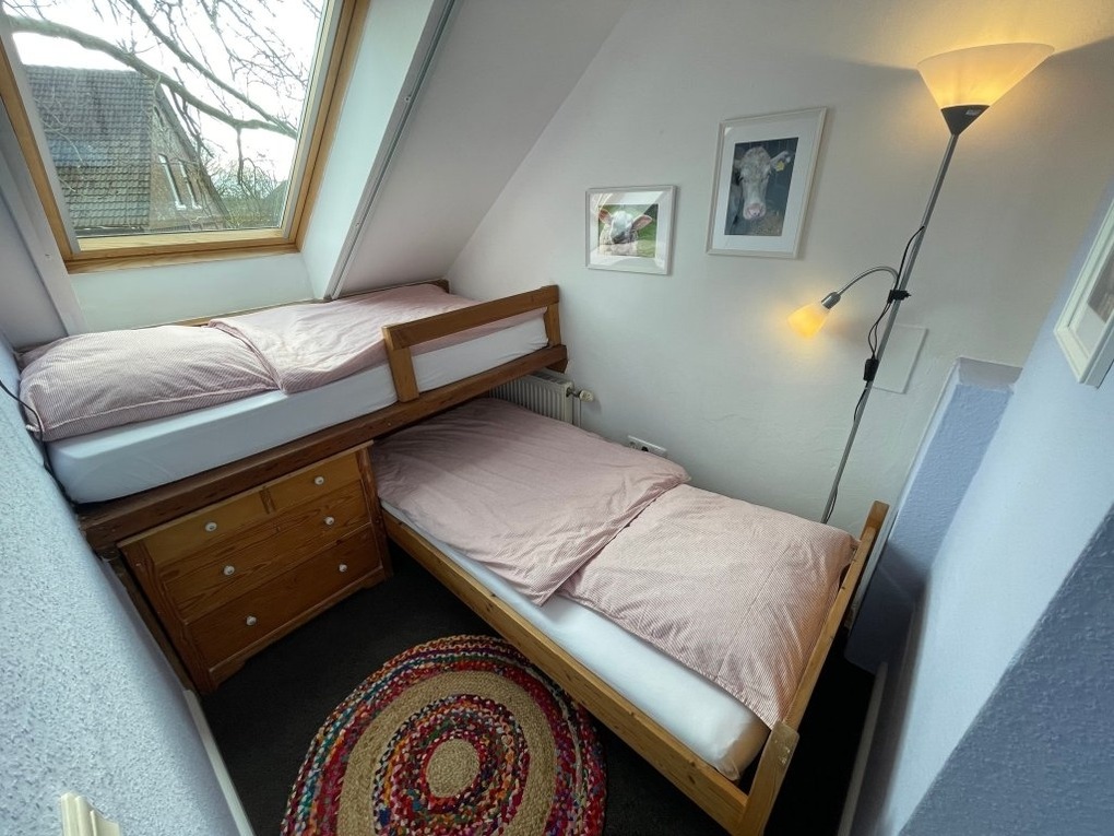 Die ca. 104 qm2 große Wohnung Störtebecker liegt im vorderen, zur Auffahrt gelegenen Teil des Hauses. Sie verfügt über ein geräumiges Schlafzimmer im Erdgeschoss und zwei weitere Schlafzimmer in der ersten Etage (1 Zimmer mit Doppelbett, 1 Zimmer mit Etagenbett 90x200cm und 90x 180cm). Das Doppelbett im ersten OG liegt in einem Raum der als Durchgangsraum zu werten ist.