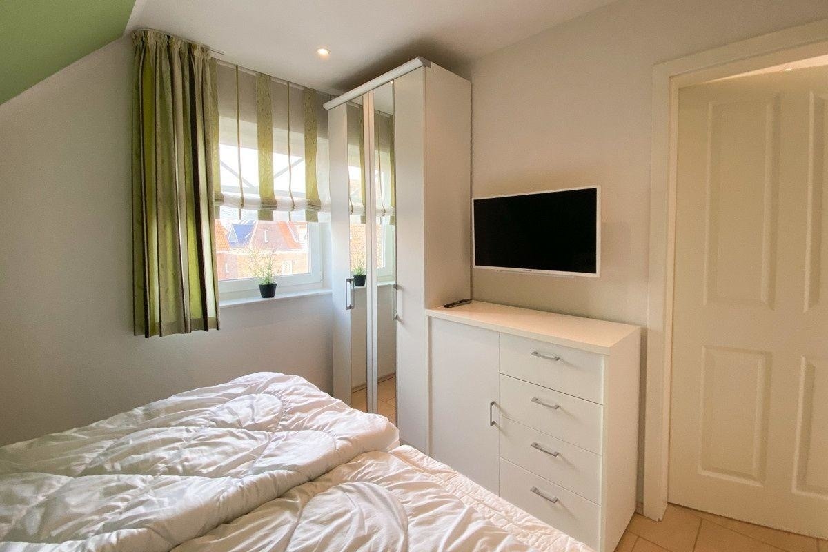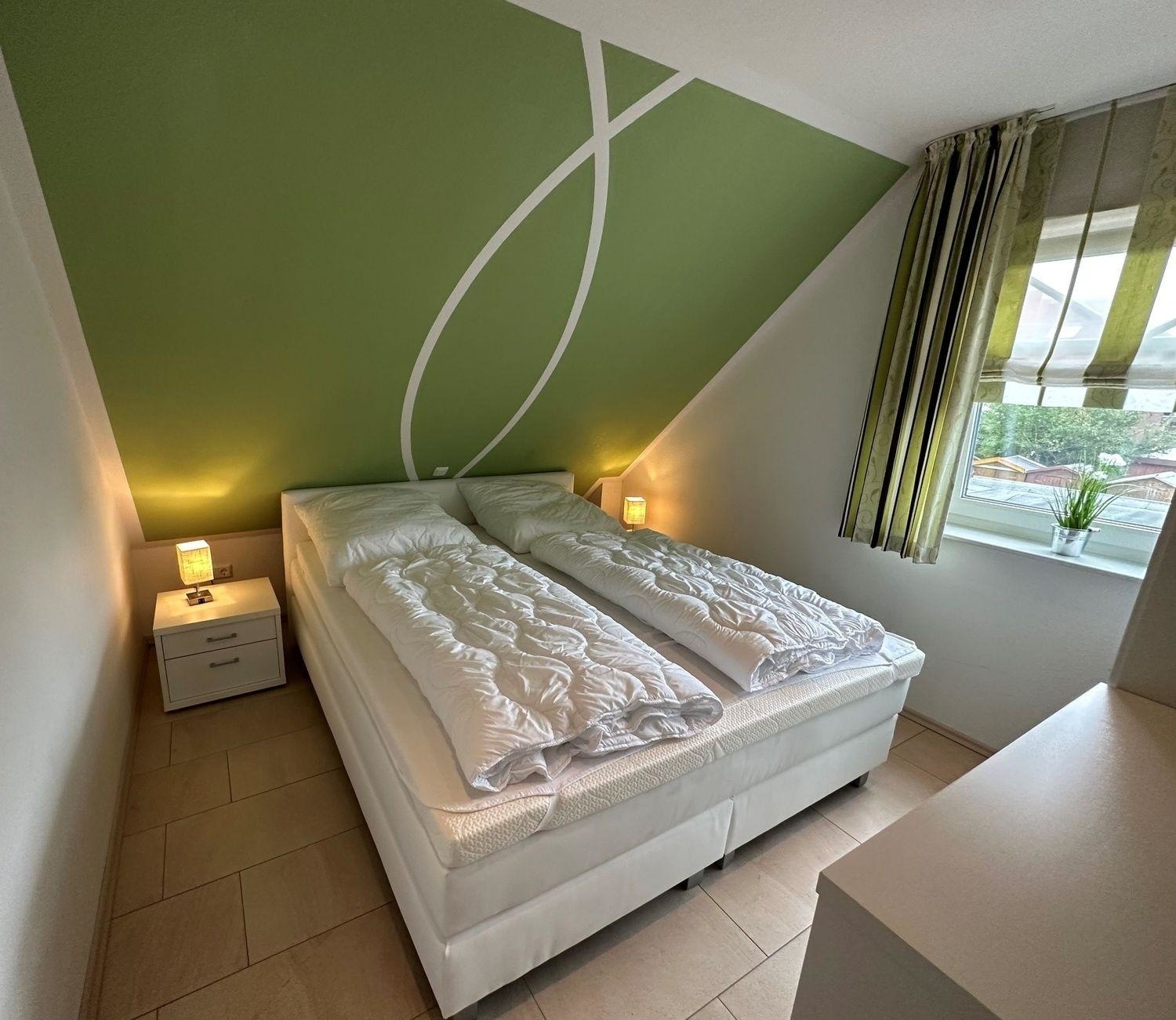 Das Schlafzimmer ist mit einem 1.80 x 2.00m großen Boxspringbett ohne Fußteil, einem Kleiderschrank, einer Kommode, LCD-TV sowie dimmbaren TouchIt-Nachttischlampen mit USB-Ladefunktion ausgestattet.