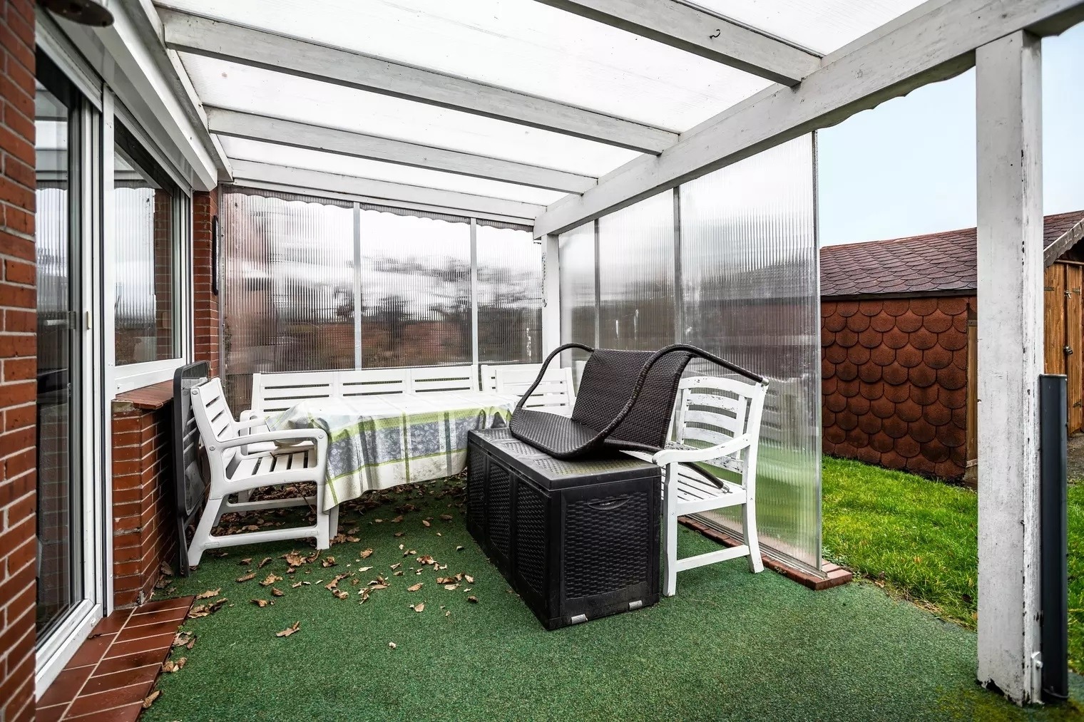 Das Ferienhaus verfügt über einen privaten Außenbereich mit Garten und einer überdachten Terrasse.