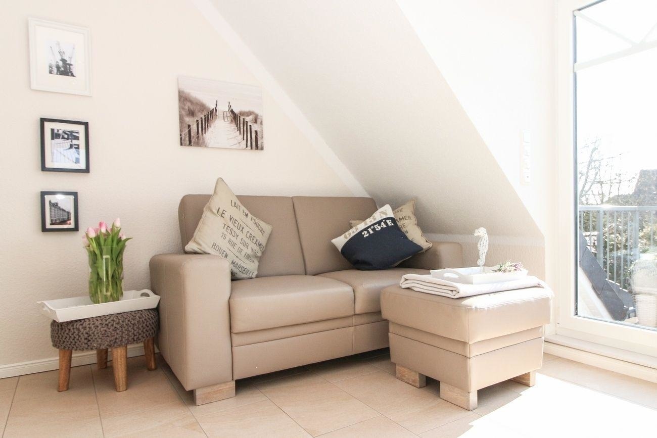 Entspannung finden Sie im Wohnbereich auf der modernen Couch mit Hocker. Sanfte Klänge können Sie der Onkyo Mini-Hifi-Anlage mit iPod Docking-Station via Bluetooth entlocken. Ein Flachbildschirm-TV trägt zur Unterhaltung bei.