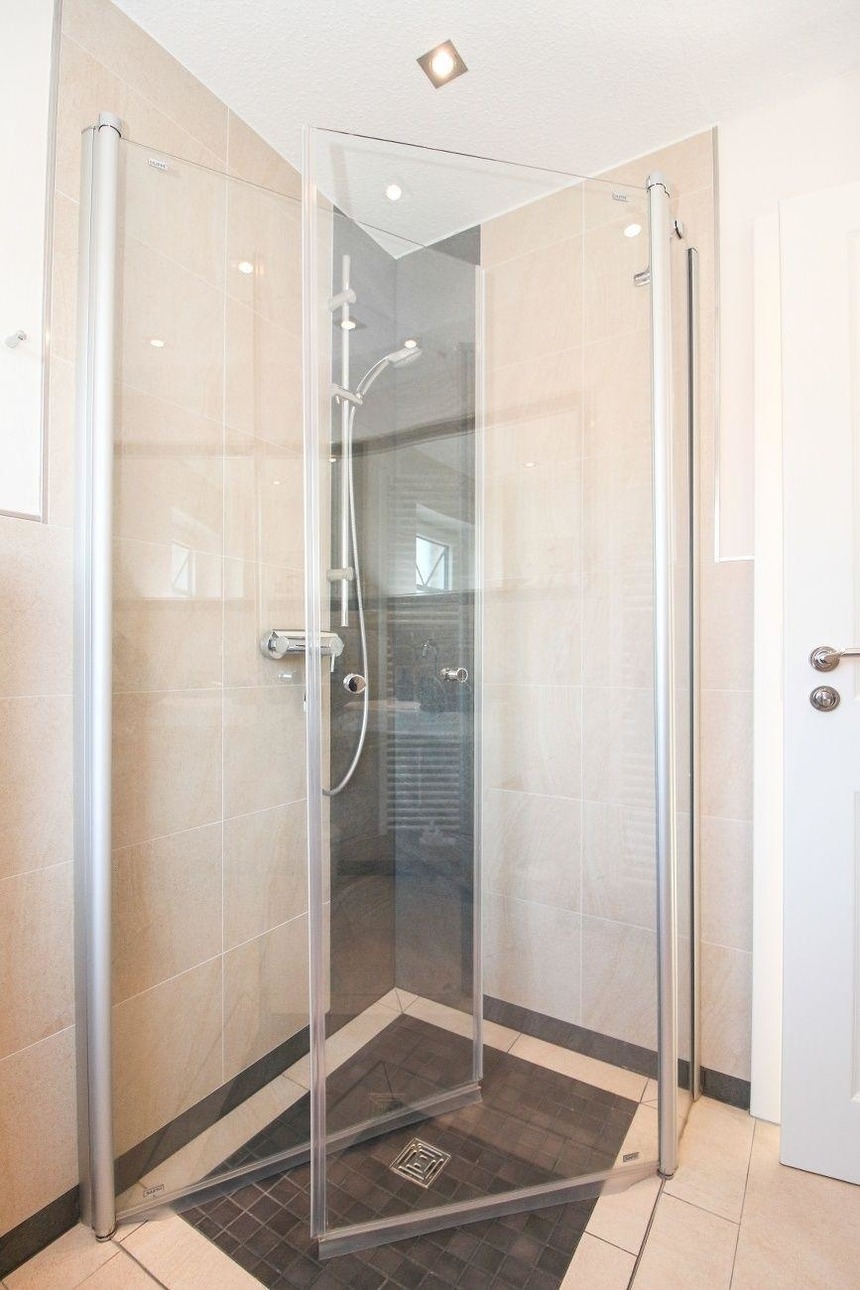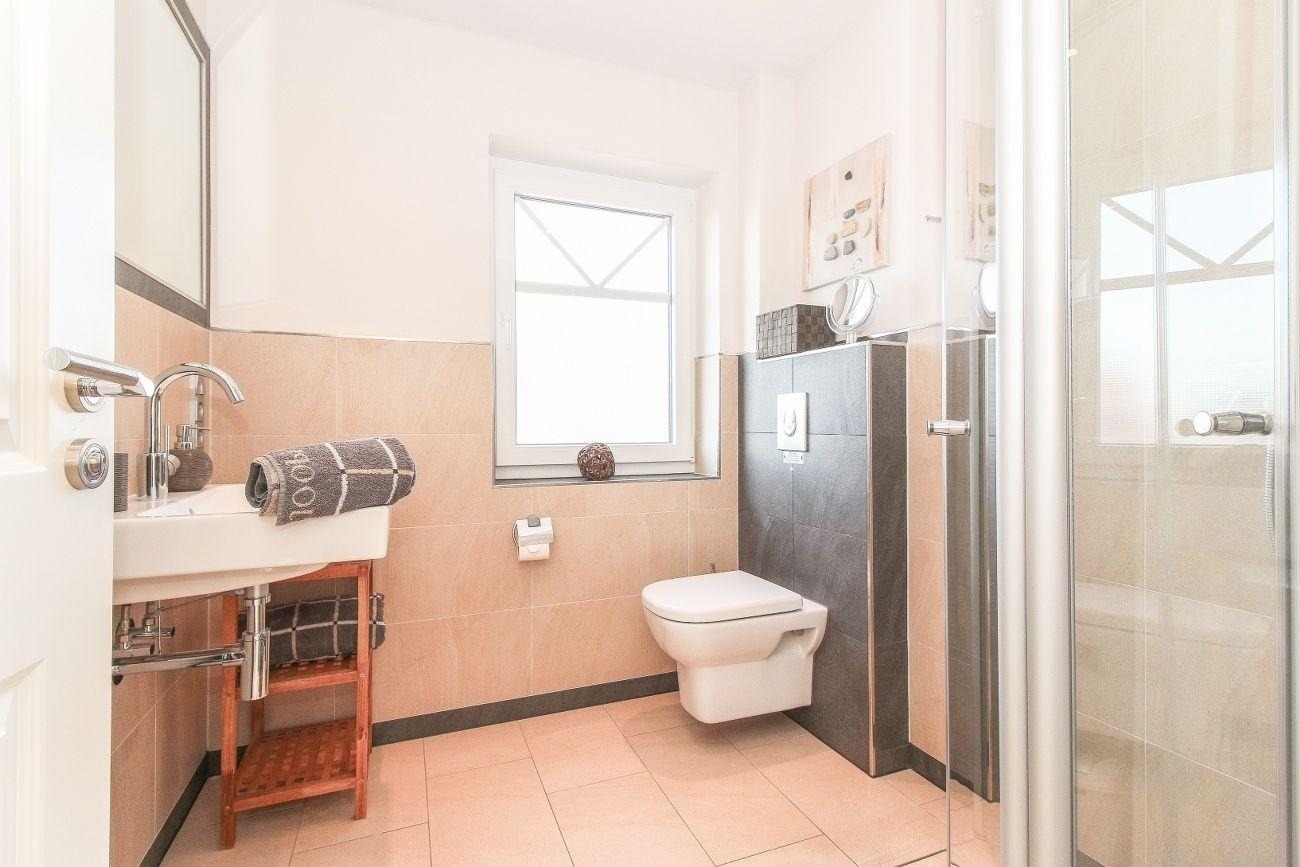 Einen guten Start in den Tag beginnen Sie am Besten in dem wunderschönen, lichtdurchfluteten Badezimmer. Die bodenebene Dusche mit Glastrennwänden und die gut durchdachte Zusammenstellung von Fliesen und Farben verleihen dem Bad ein edles Flair.