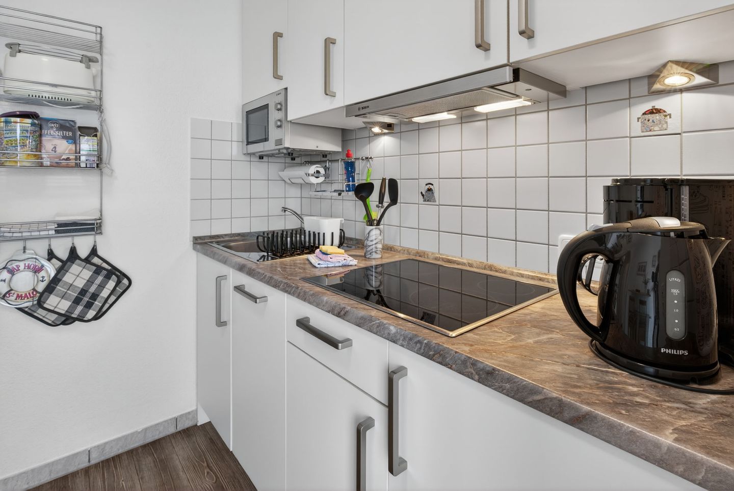 Die Wohnung verfügt über zwei Schlafzimmer, eines ist mit einem Doppelbett und das andere ist mit zwei Einzelbetten ausgestattet. Vom Wohnzimmer aus kann man direkt auf die Terrasse gehen. Die separate Küche ist modern und funktional eingerichtet. Das Badezimmer ist mit einer Dusche und einer Waschmaschine ausgestattet. Hier darf auch der vierbeinige Freund mitkommen, denn die Ferienwohnung heißt auch Hunde herzlich willkommen. Erlaubt ist maximal 1 Hund (Höhe maximal kniehoch). Die Hundewiese befindet sich in der Nähe des Fährhafens (kein Leinenzwang).