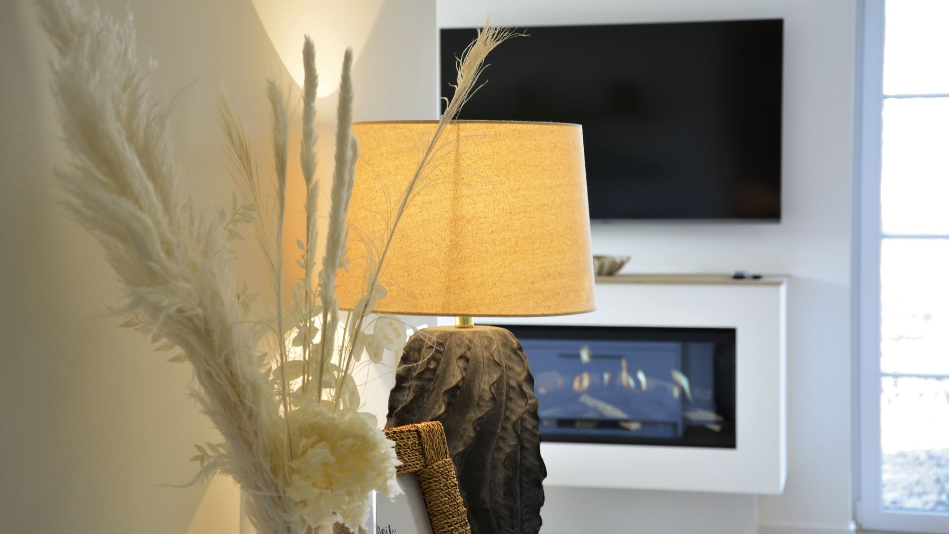Gemütlicher Wohnbereich mit Elektrokamin und Smart-TV.