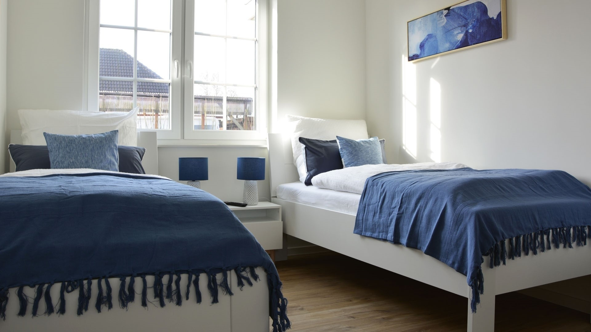 Zwei Schlafzimmern, ausgestattet mit 1 Boxspringbett (180×200 cm) & 2 Einzelbetten (100×200 cm) und Zusatz-TV.