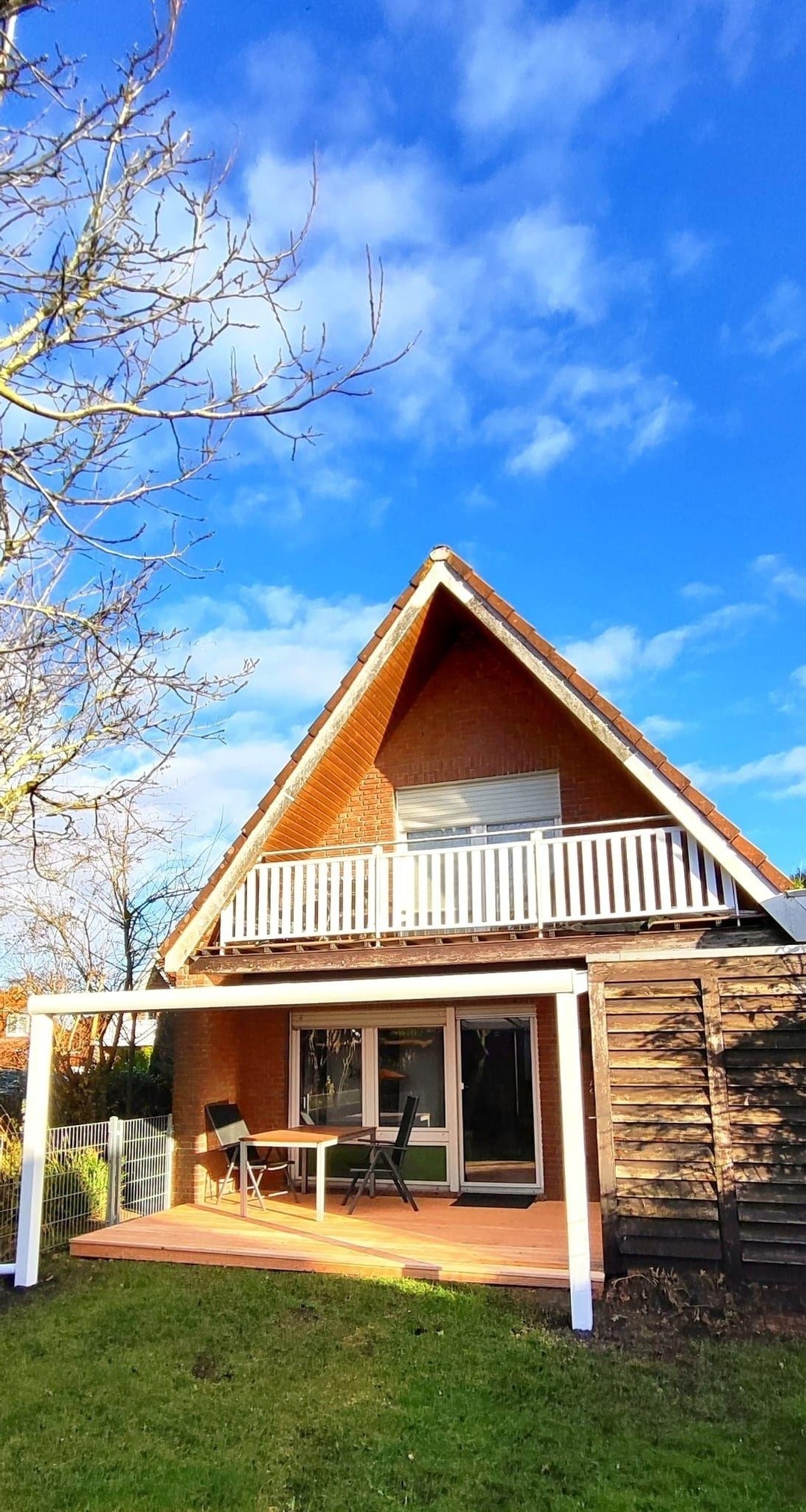 Die Ferienwohnung ist in zwei Etagen eingeteilt. Im Erdgeschoss befindet sich das Wohnzimmer, die Küche mit Essplatz, das Badezimmer mit Dusche und die überdachte Terrasse. Der Garten ist komplett eingezäunt.