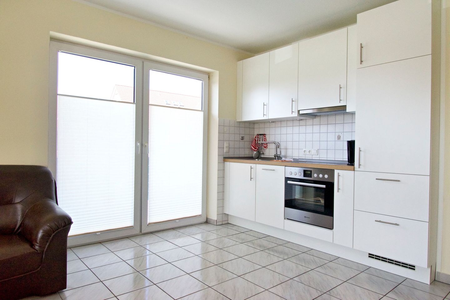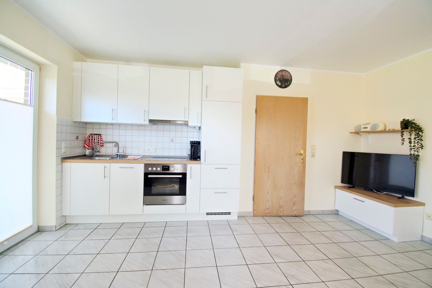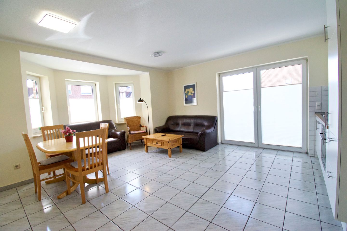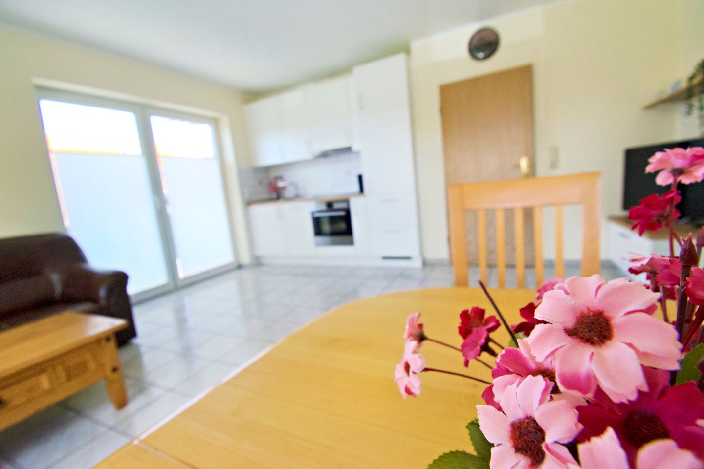 Sie wohnen in einer 55 m² großen, 3-Zimmer-Wohnung, mit 2 getrennten Schlafzimmern im Erdgeschoss. Küche und Bad verfügen jeweils über Tageslicht. Die gemütliche Wohn-Küche hat eine Küchenzeile mit großem Kühlschrank, Cerankochfeld, Backofen und Mikrowelle, und ist voll eingerichtet.