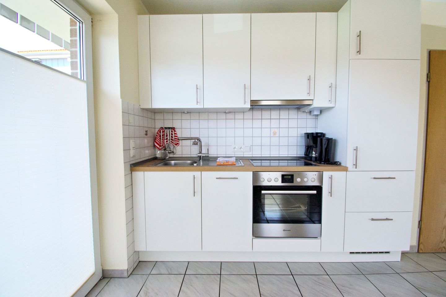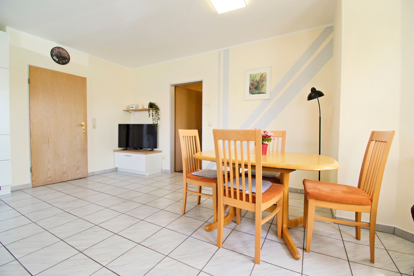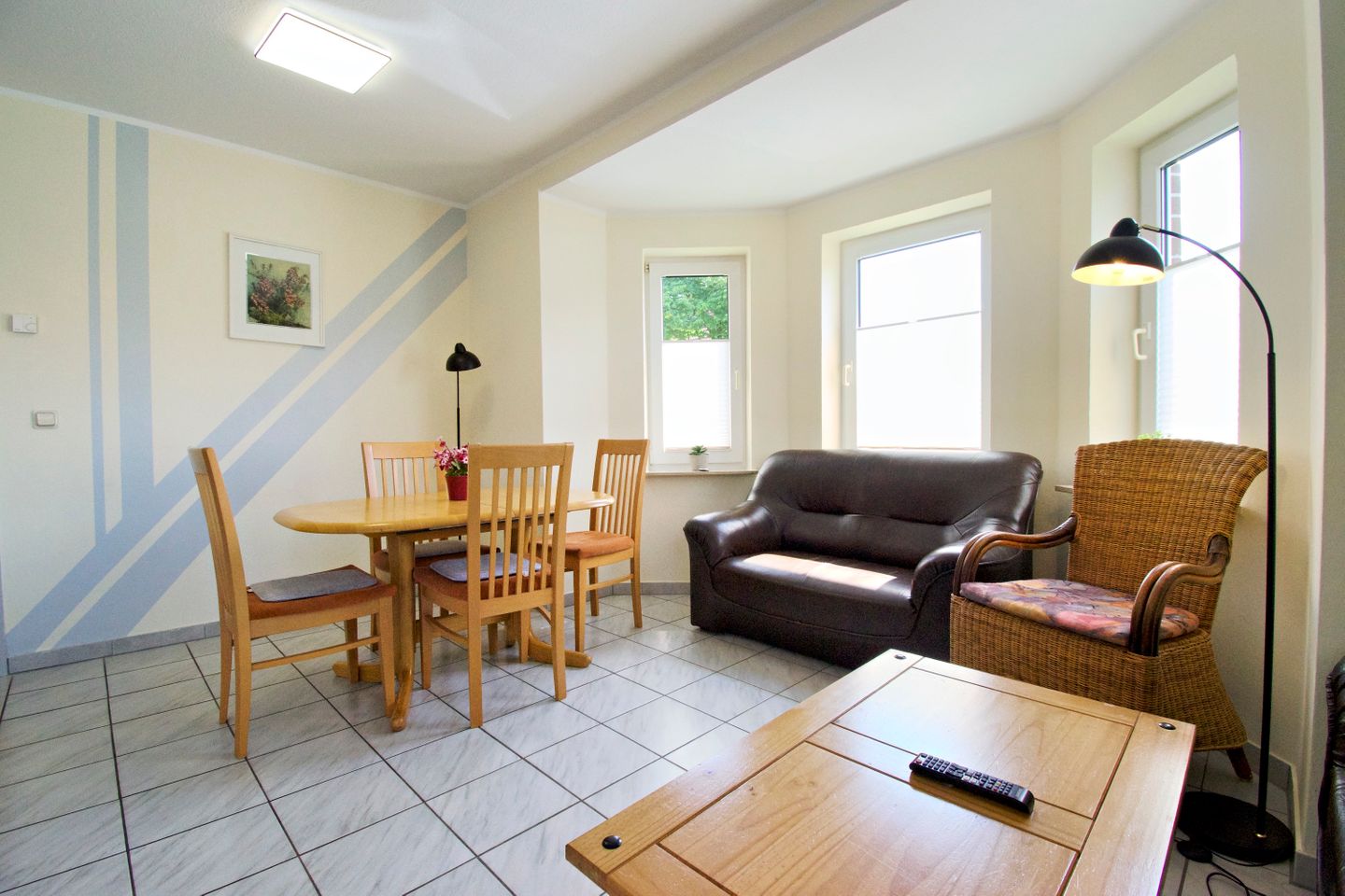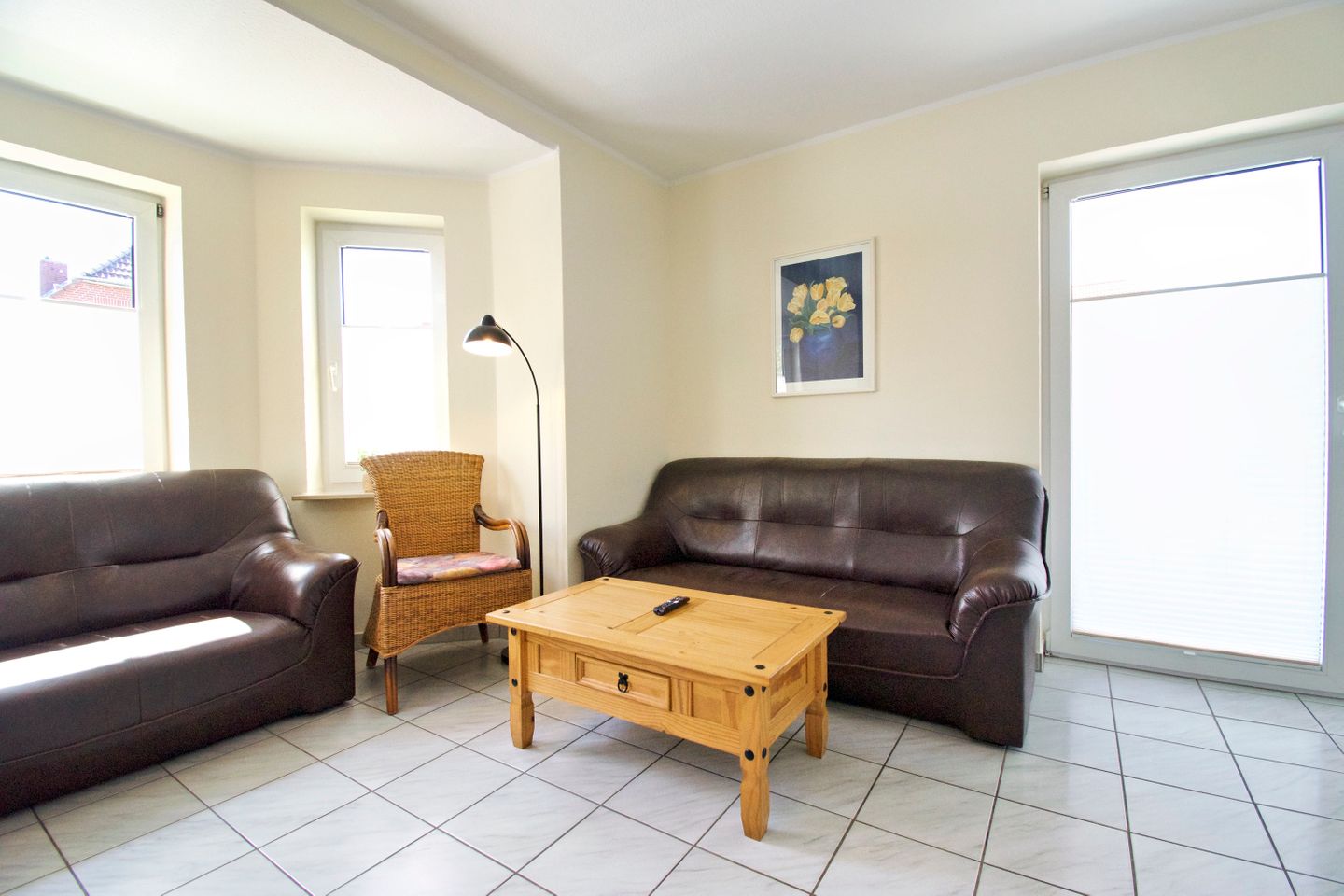 Sie wohnen in einer 55 m² großen, 3-Zimmer-Wohnung, mit 2 getrennten Schlafzimmern im Erdgeschoss. Küche und Bad verfügen jeweils über Tageslicht. Die gemütliche Wohn-Küche hat eine Küchenzeile mit großem Kühlschrank, Cerankochfeld, Backofen und Mikrowelle, und ist voll eingerichtet.