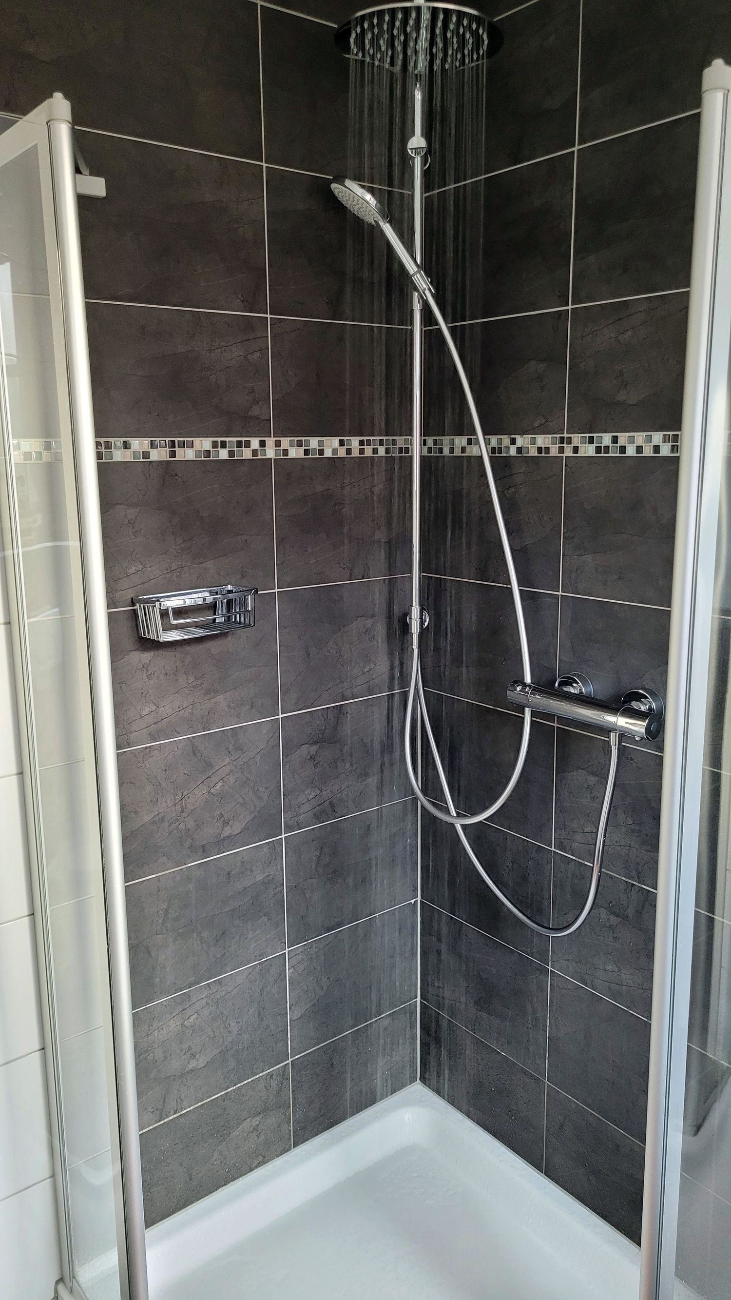 Wenn Sie das topmoderne Duschbad betreten sehen Sie, dass sich Gegensätze anziehen und die schwarzen und weißen Fliesen für eine erfrischende Optik sorgen. Der Handtuchwärmer und Fön vervollständigen das Badezimmer.