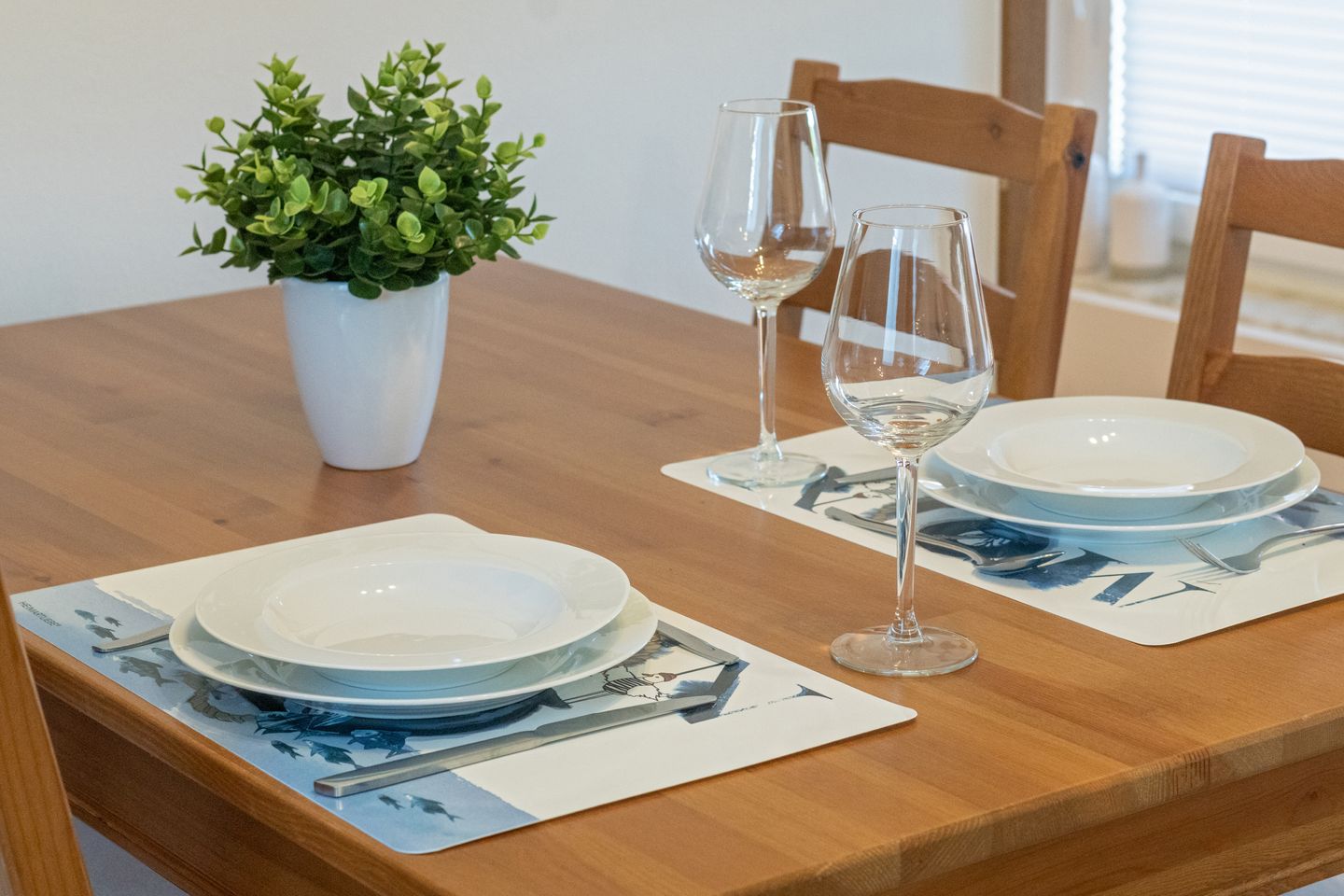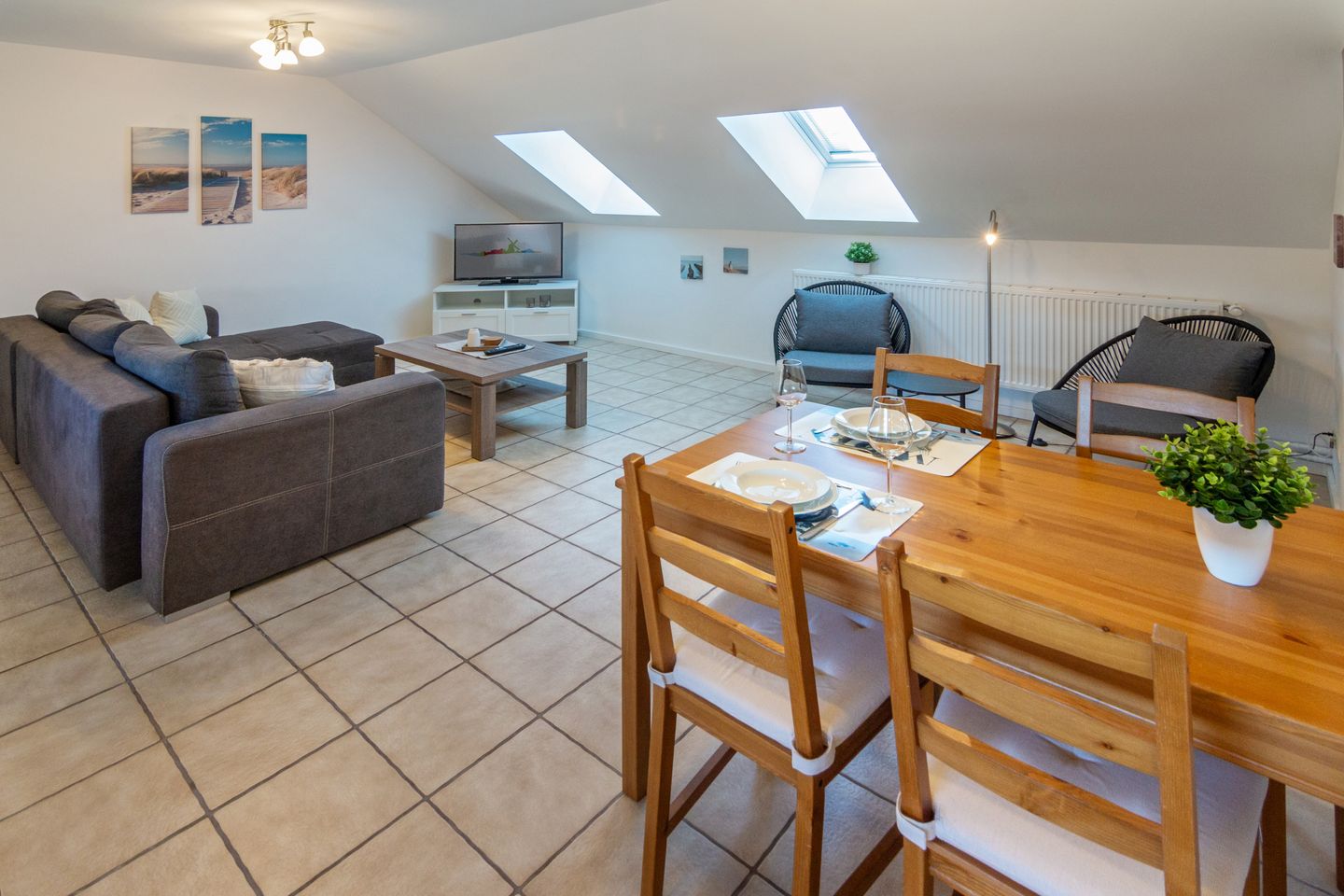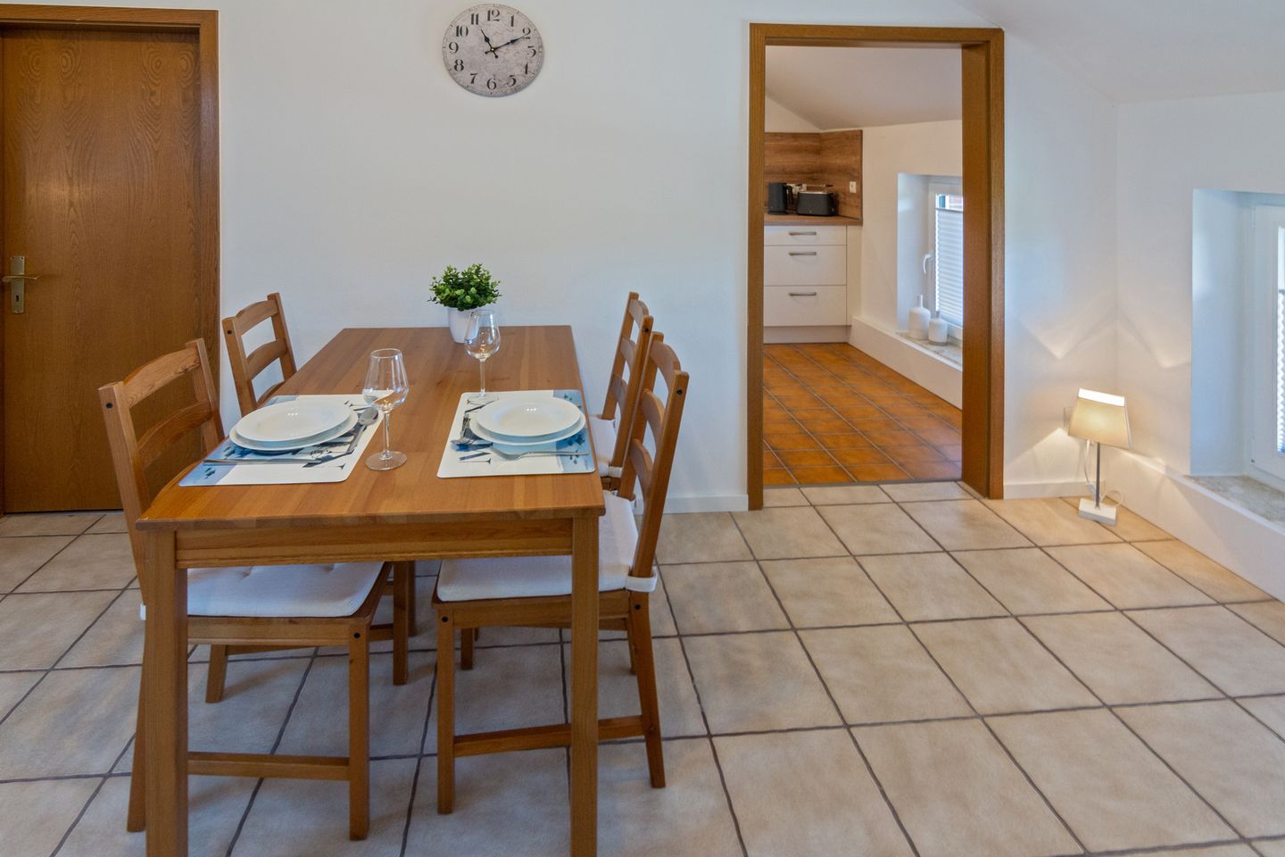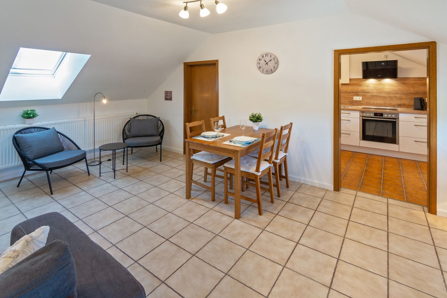 Die Ferienunterkunft besticht durch eine praktische, geschlossene Küche, die mit modernen Elektrogeräten und umfangreicher Ausstattung keine Wünsche offenlässt. Hierzu zählen ein Ceran-Kochfeld, ein Backofen, eine Spülmaschine, ein Kühlschrank mit integriertem Gefrierfach, Wasserkocher, Kaffeemaschine, Toaster, Mixer sowie sämtliche notwendigen Küchenutensilien, Geschirr und Besteck. Der angrenzende Essbereich mit Esstisch bietet den optimalen Rahmen für gemeinsame Mahlzeiten.