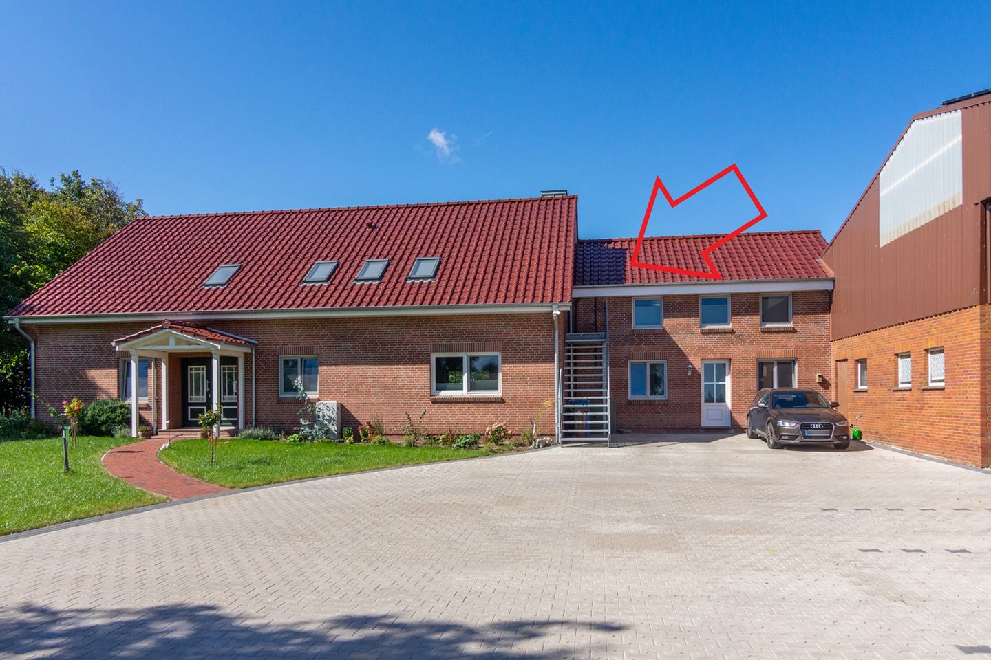 Ein besonderes Highlight stellt die gemeinschaftlich nutzbare, möblierte Terrasse dar, die den Zugang zum gepflegten Garten und der Liegewiese eröffnet. Der Blick auf die umliegende ostfriesische Landschaft lädt zum Entspannen ein. Für Ihr Fahrzeug steht ein Privatparkplatz direkt am Haus bereit.