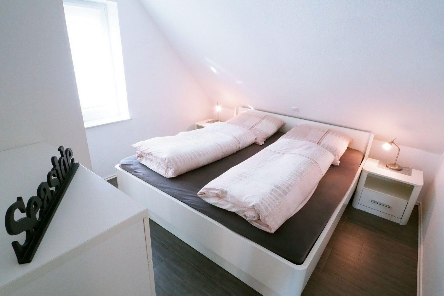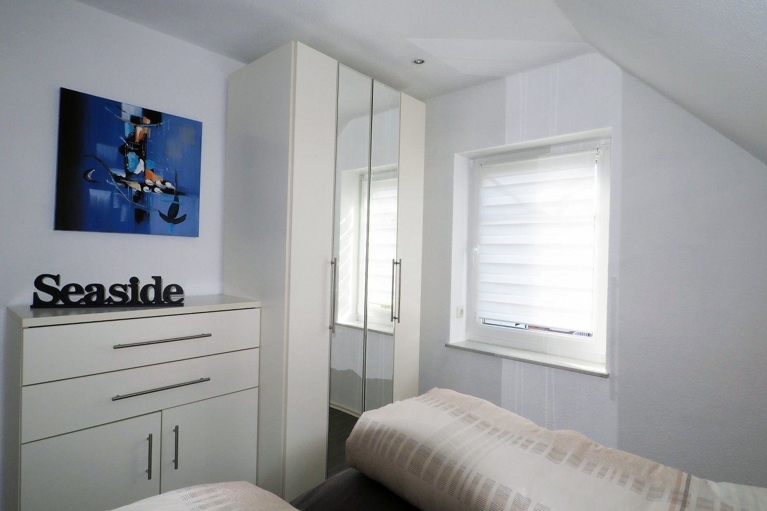 Im hellen Schlafzimmer finden Sie ein Doppelbett ohne Fußteil vor. Für weiteren Komfort sorgt ein geräumiger Kleiderschrank mit großem Spiegel und eine Kommode.