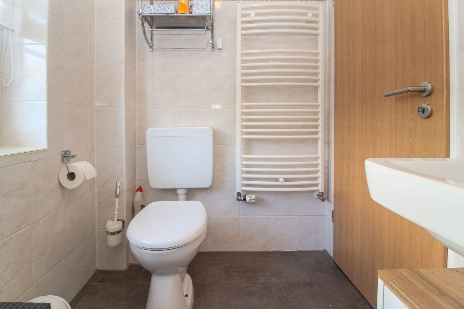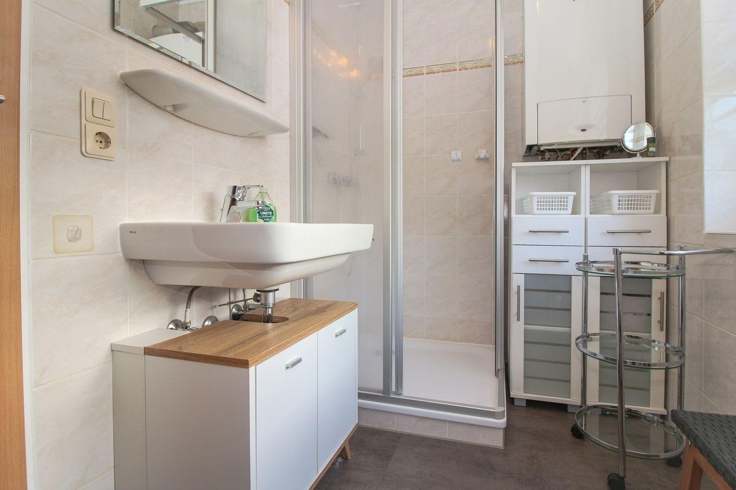 Sie finden in der Wohnung ein modernes Tageslicht-Badezimmer mit Dusche (flacher Einstieg), WC und Waschtisch.