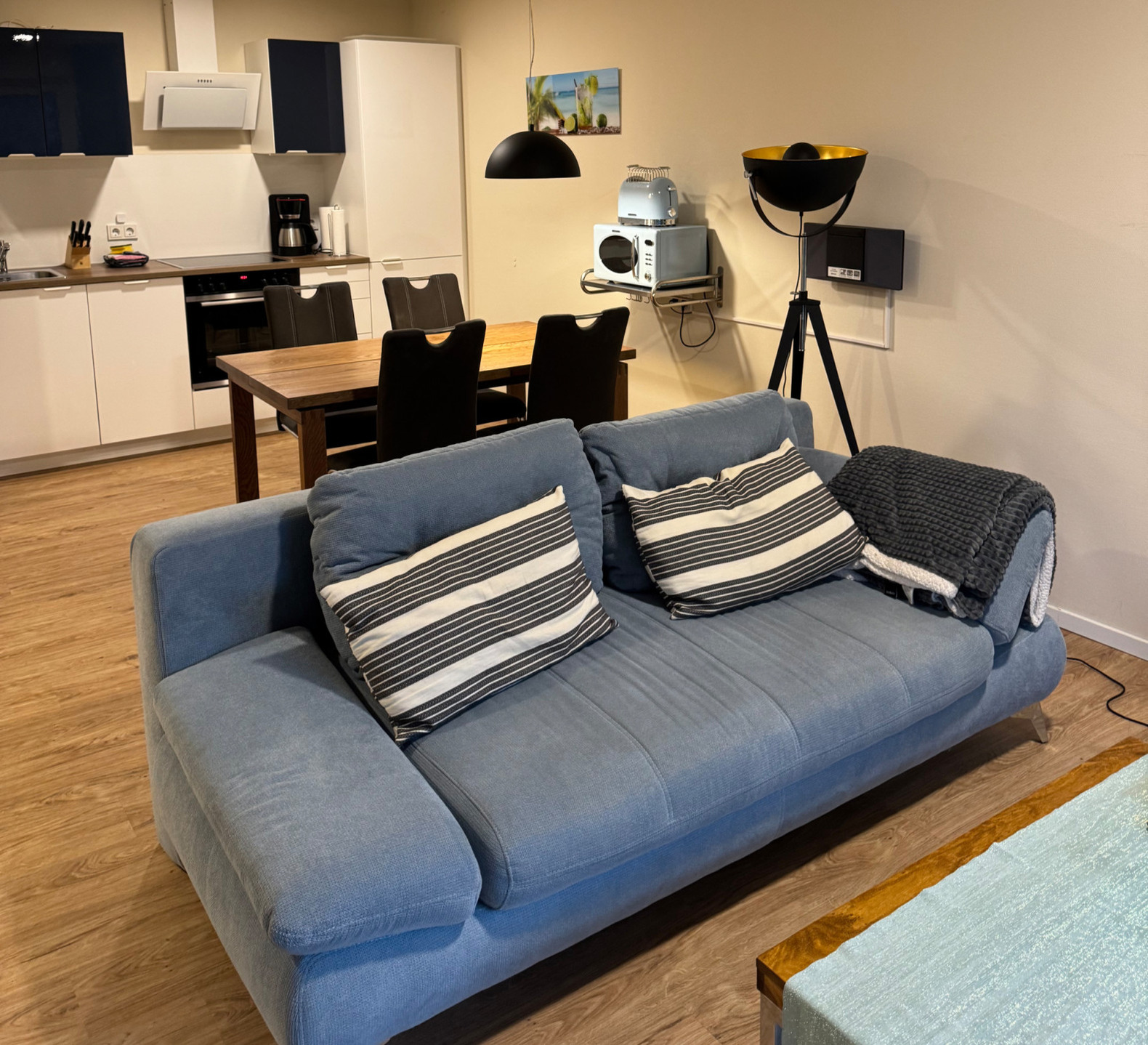 In dem hellen und geräumigen Wohnzimmer haben Sie die Möglichkeit, es sich auf dem Schlafsofa mit einem guten Buch gemütlich zu machen oder einen Film zu schauen. Unsere Ferienwohnung ist mit einer Fußbodenheizung ausgestattet. Für einen noch größeren Wohlfühlfaktor können Sie im Kamin ein loderndes Feuer entfachen.