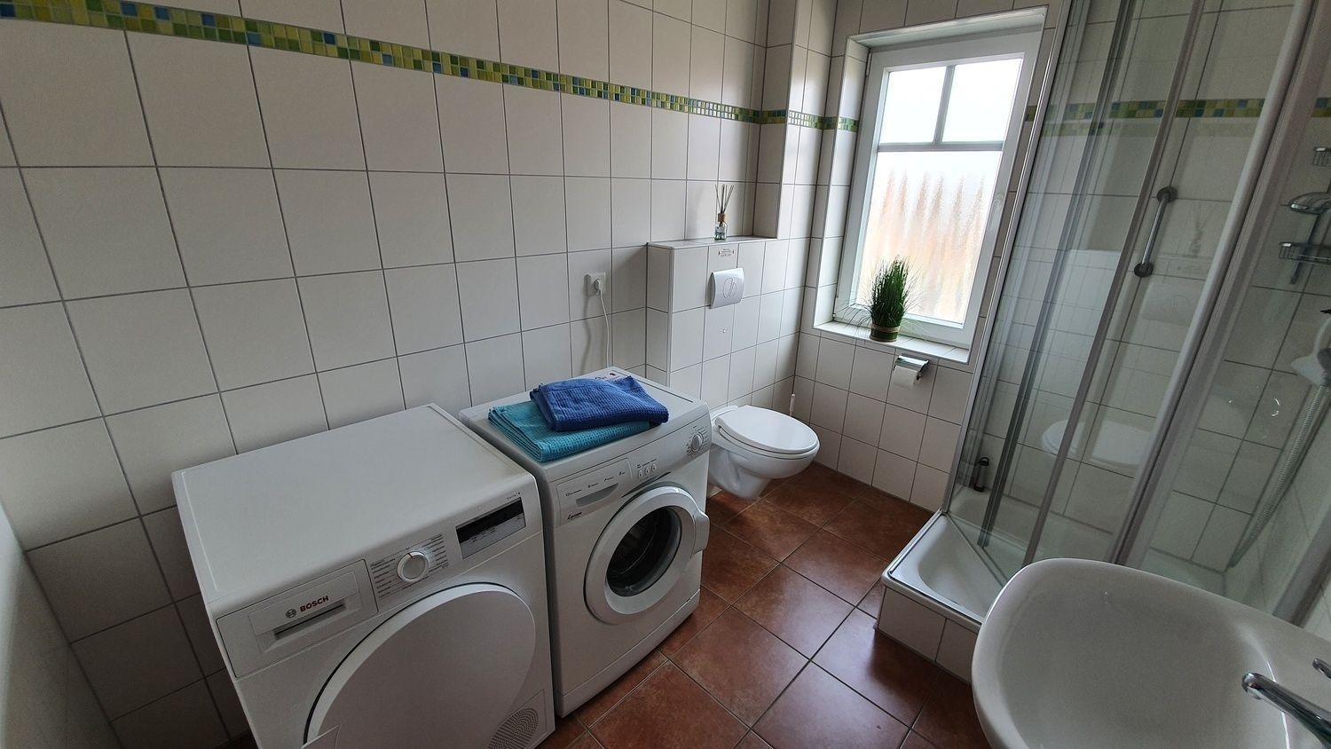 Das farblich harmonisch abgestimmte Tageslicht-Bad verfügt über eine Waschmaschine und Trockner.