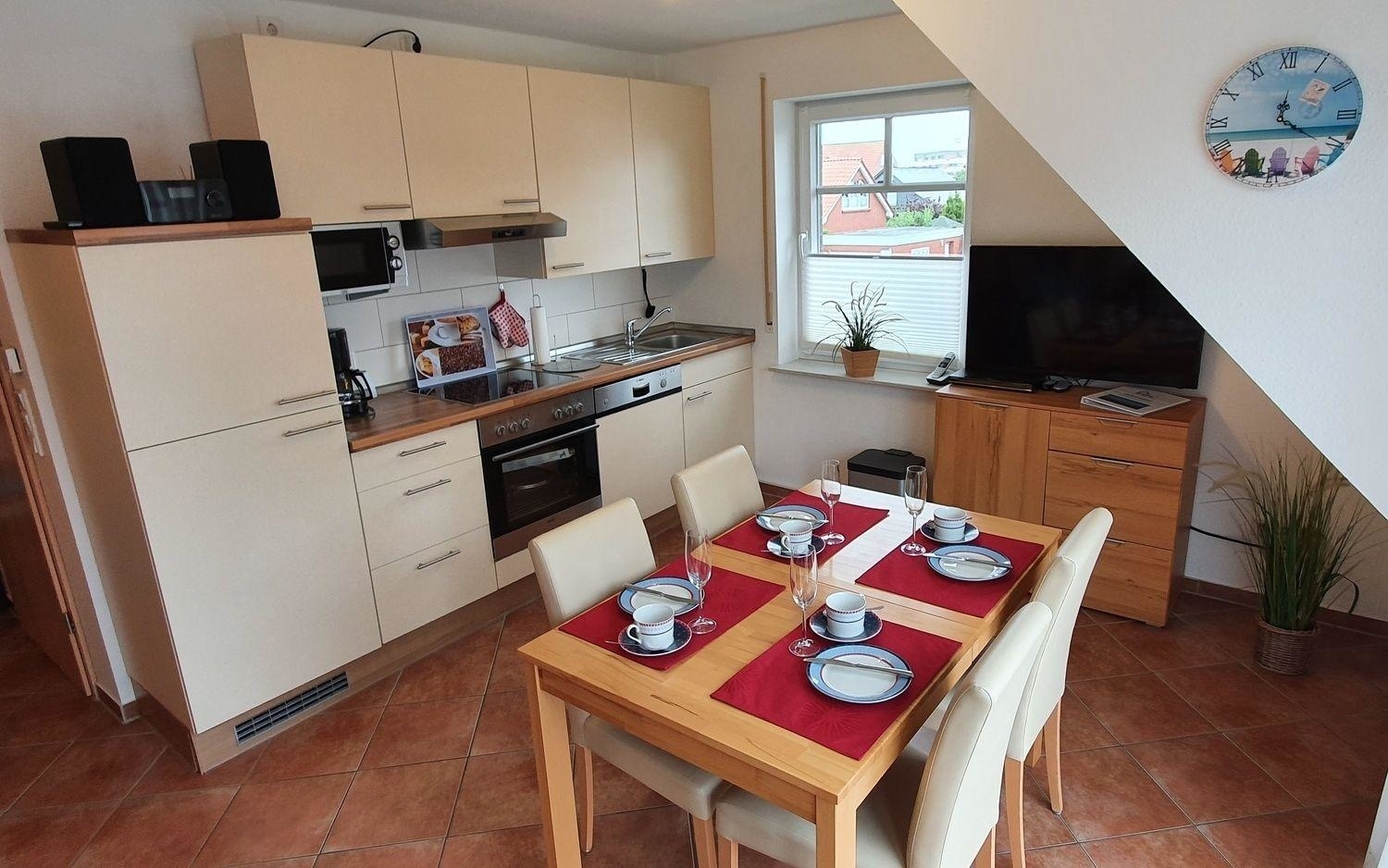 Die Komfort-Einbauküche verfügt über einen Herd mit Cerankochfeld, Umluftbackofen, Spülmaschine, Kühlschrank mit sep. Gefrierfach, Mikrowelle, Senseo, Toaster, Kaffeemaschine, Wasserkocher, Eierkocher, Mixer, ausreichend Geschirr und allen notwendigen Küchenutensilien. Hier wird das Kochen zum Vergnügen.