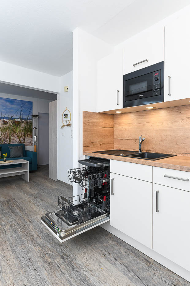 Genießen Sie Ihren Urlaub in vollen Zügen, bei schönem Wetter auch draußen auf der Terrasse. Die gut ausgestattete Küche besitzt unter anderem einen Kühlschrank, einen Herd zum Kochen und sogar eine Spülmaschine.