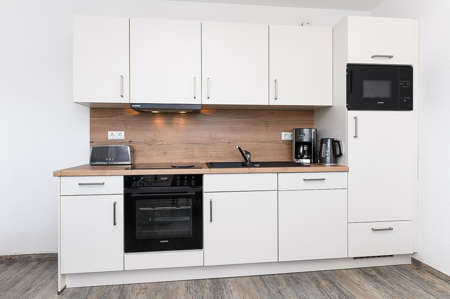 Genießen Sie Ihren Urlaub in vollen Zügen, bei schönem Wetter auch draußen auf der Terrasse. In der gut ausgestatteten Küche finden Sie neben einem Kühlschrank auch eine Mikrowelle und einen Backofen.