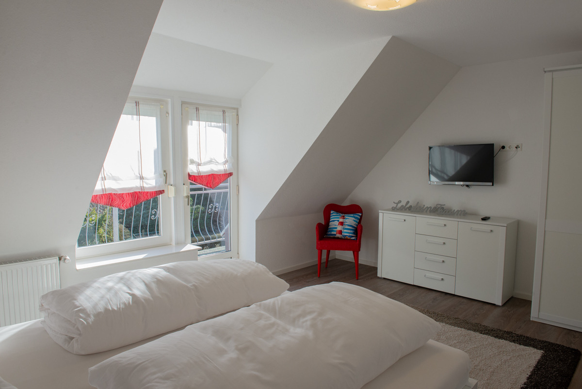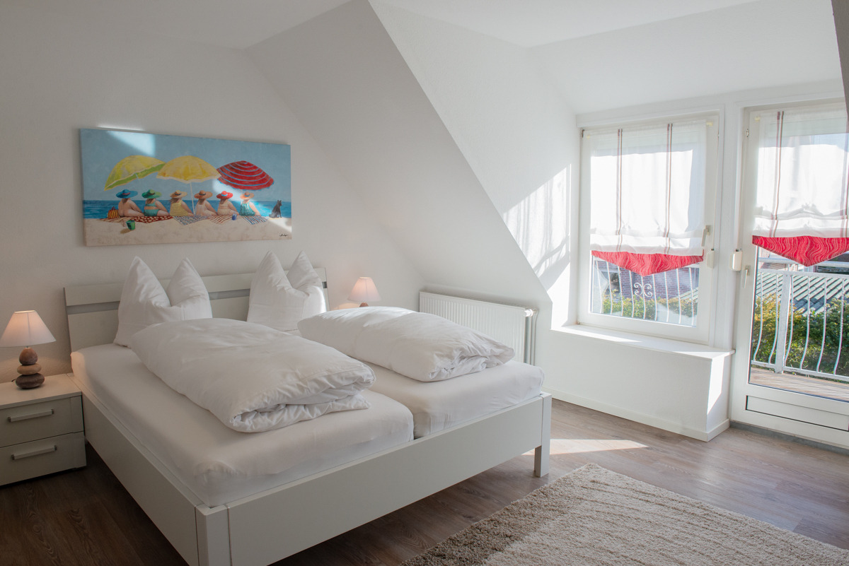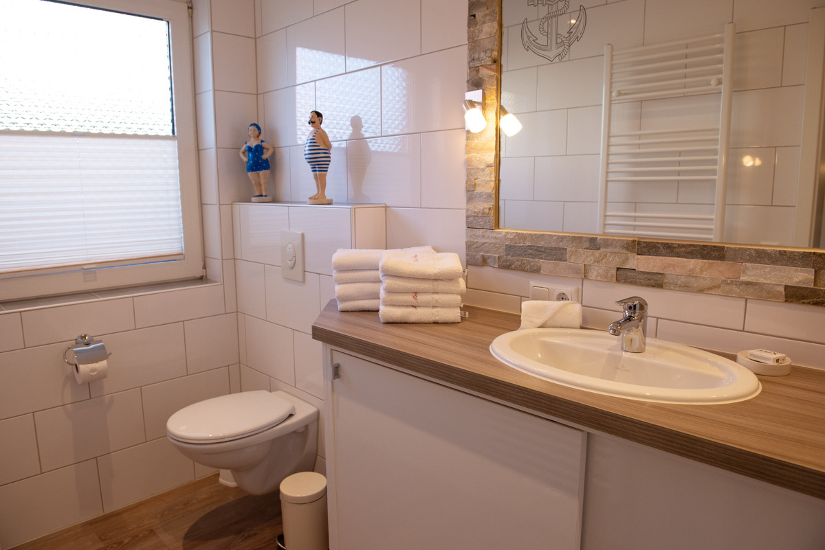 Die Ferienwohnung Stürbord verfügt über zwei getrennte Schlafzimmer im 1. OG, davon ist ein Schlafzimmer mit Außenrolläden und SAT-TV ausgestattet. Außerdem befindet sich im 1. OG ein zusätzliches WC. Das moderne Bad / WC ist mit Fenster, einer bodenebenen Dusche und einem Handtuchhalter – Heizkörper ausgestattet.