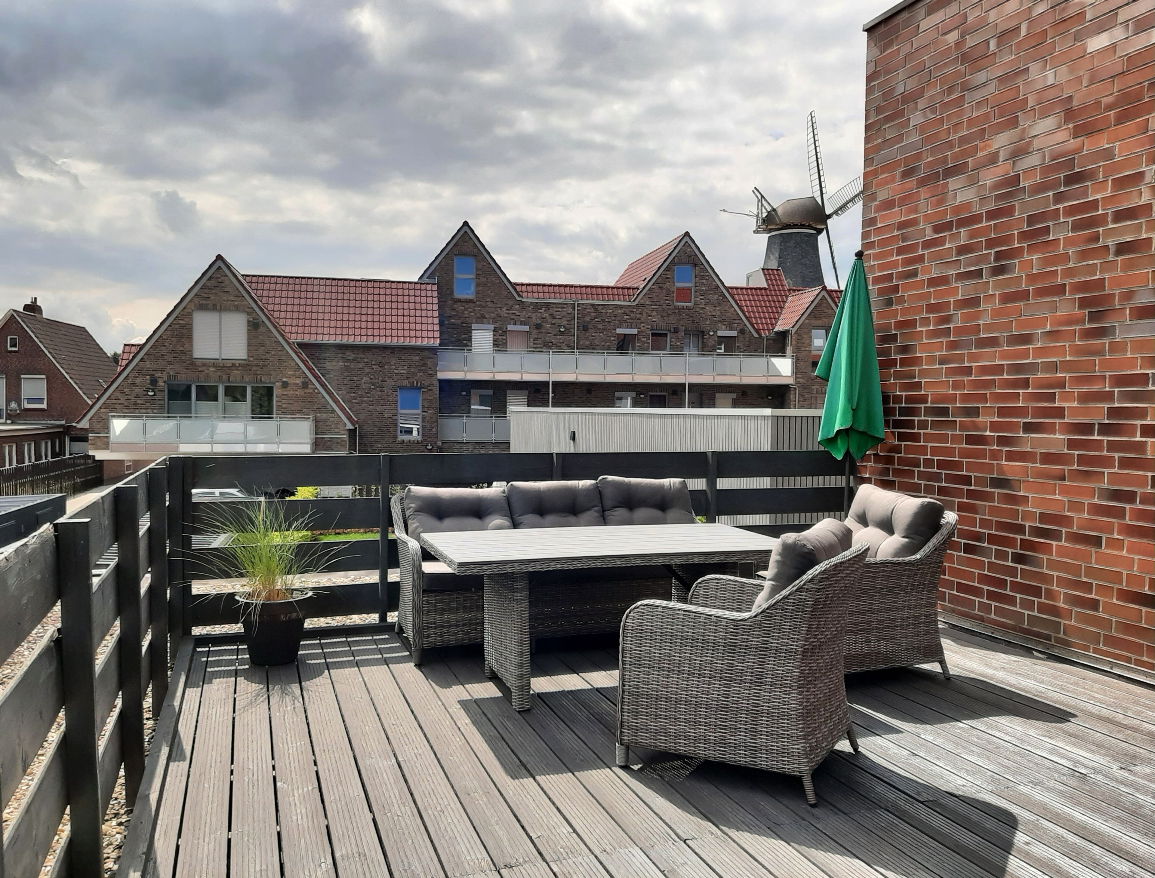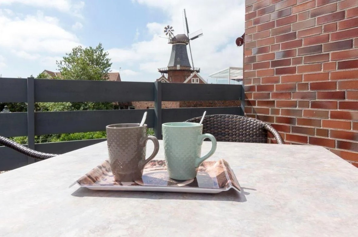 Die Dachterrasse ist das Highlight dieser Ferienwohnung und bietet einen herrlichen Blick auf die umliegende Umgebung, mit besonders beeindruckendem Blick auf die historische Windmühle – ein perfektes Fotomotiv und ein einzigartiger Anblick.